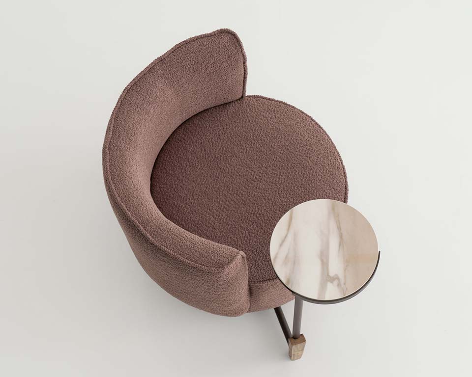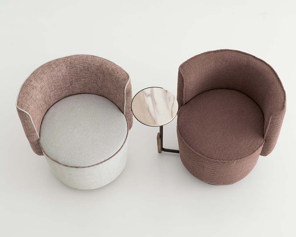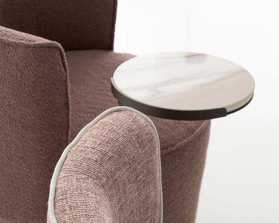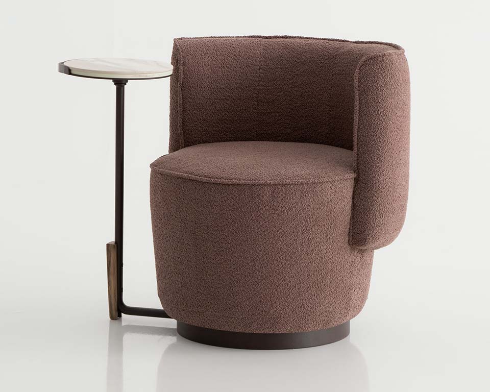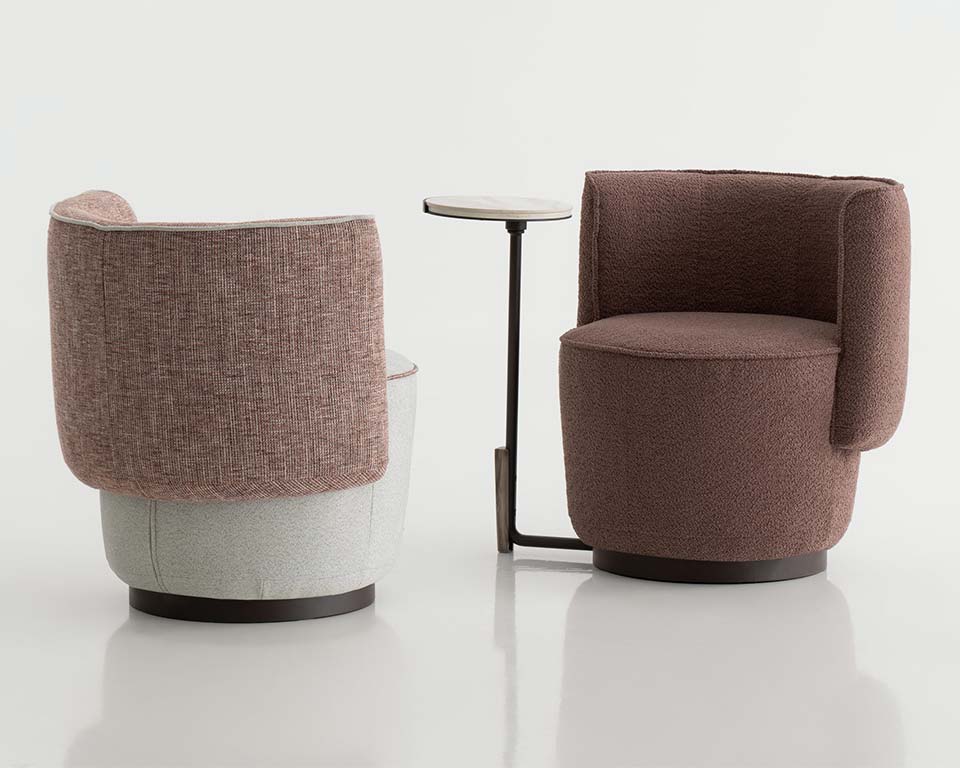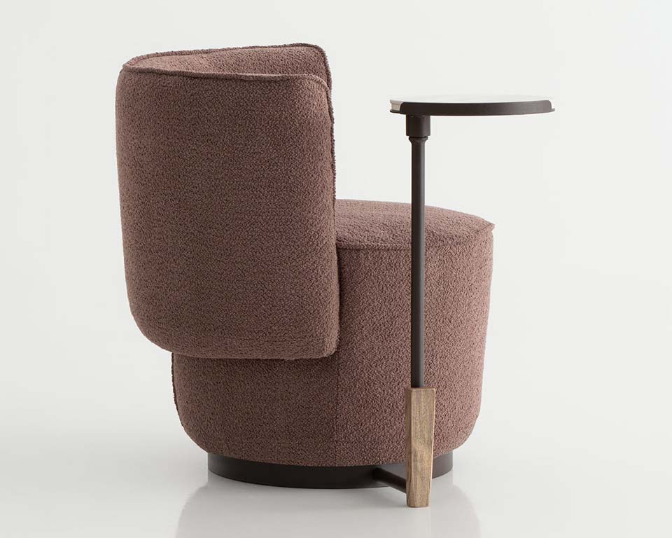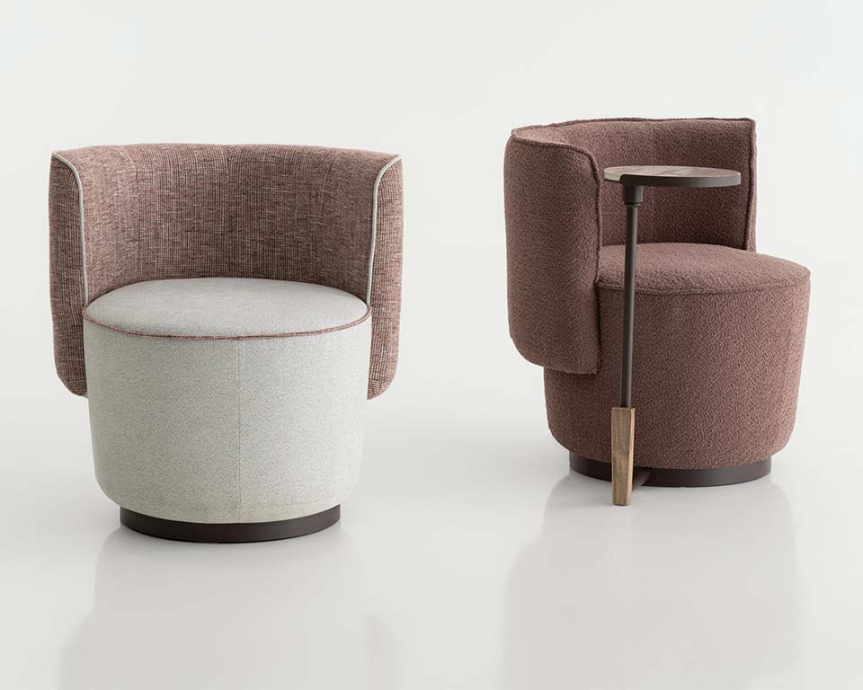 Armchair suitable for home and Hotels. Apparently inspired by the shape of a tulip, it can comfortably accommodate one person for a meal, for a meeting, for a quick coffee break or just to sit. A stable tapered base with a horseshoe-like circumferential support back to keep your body in place. It is available in three versions: a fixed one, a 360° rotating one and one with a table arm.