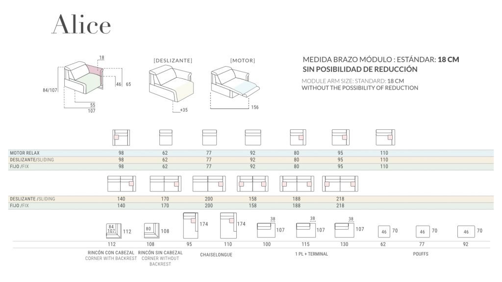 Mechanism: Electric relax, fix or sliding seat (35 cm). Multipositional headrest
