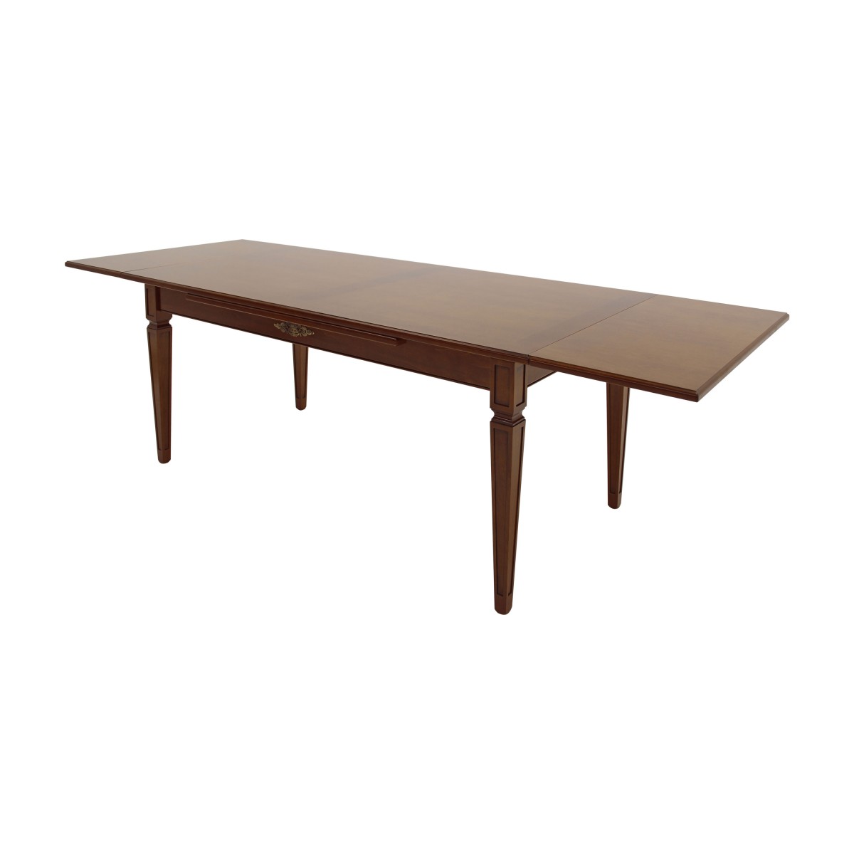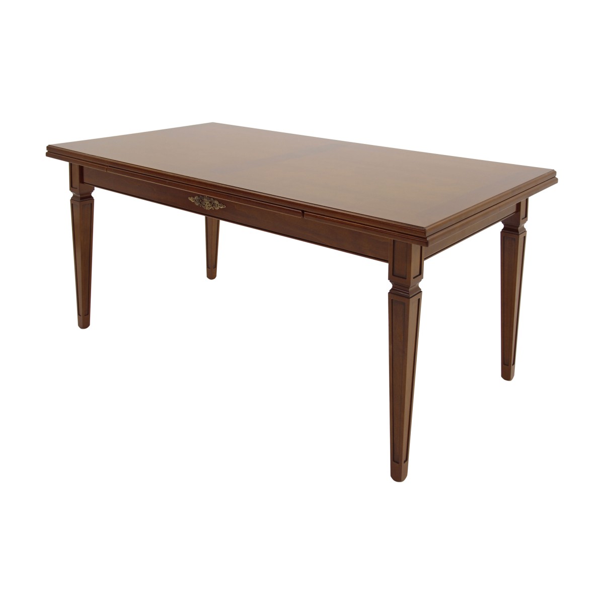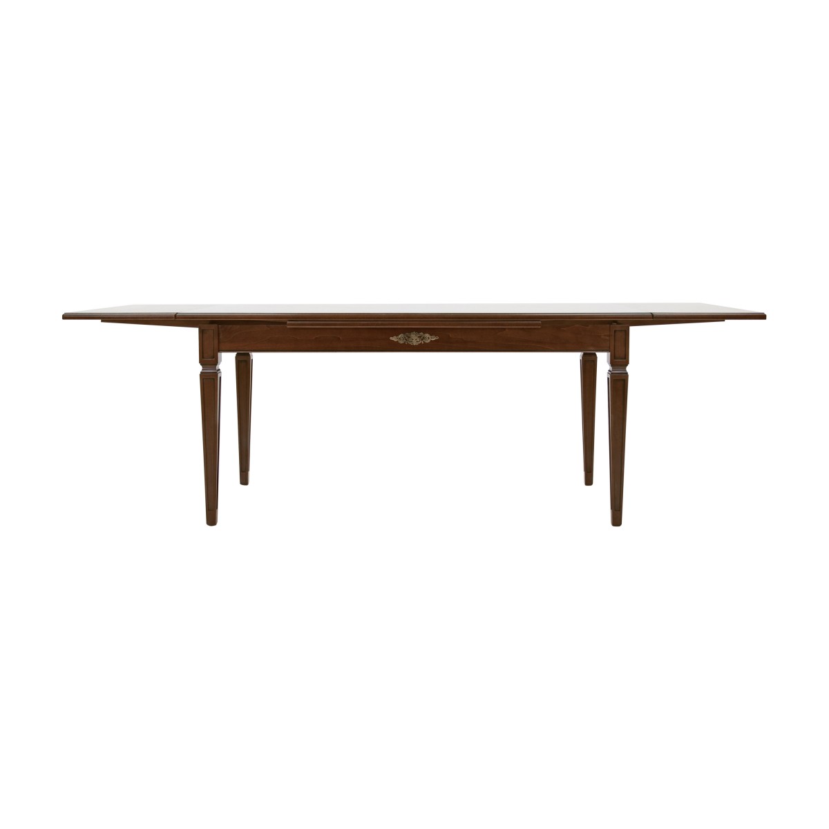 Elegant rectangular wooden table that can be easily combined with Classic style furniture. The table has, as standard feature, a top with two 40 cm extensions and two metal decorations, which are also featured on our glass sideboard Galatea art.00VE08.