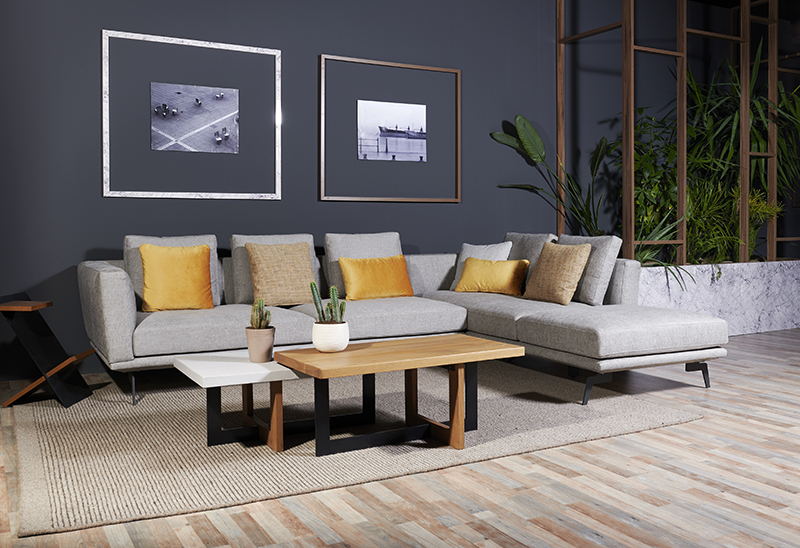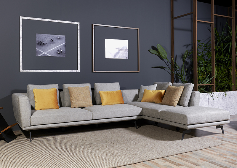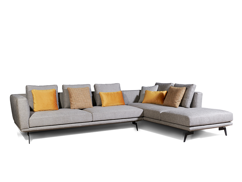 Modern corner sofa with solid wood frame. The seat cushions are form fit, full rebound high density rubber, lined with 5cm dacron wadding and placed in a cotton shell. It is possible to choose the hardness of the seat. Back cushions and trims contain goose down. The fabrics on all pillows are removable. Choice of fabric and metal or wooden legs. It offers you a multitude of solutions depending on your space. Practical design that will offer you endless moments of rest and relaxation.