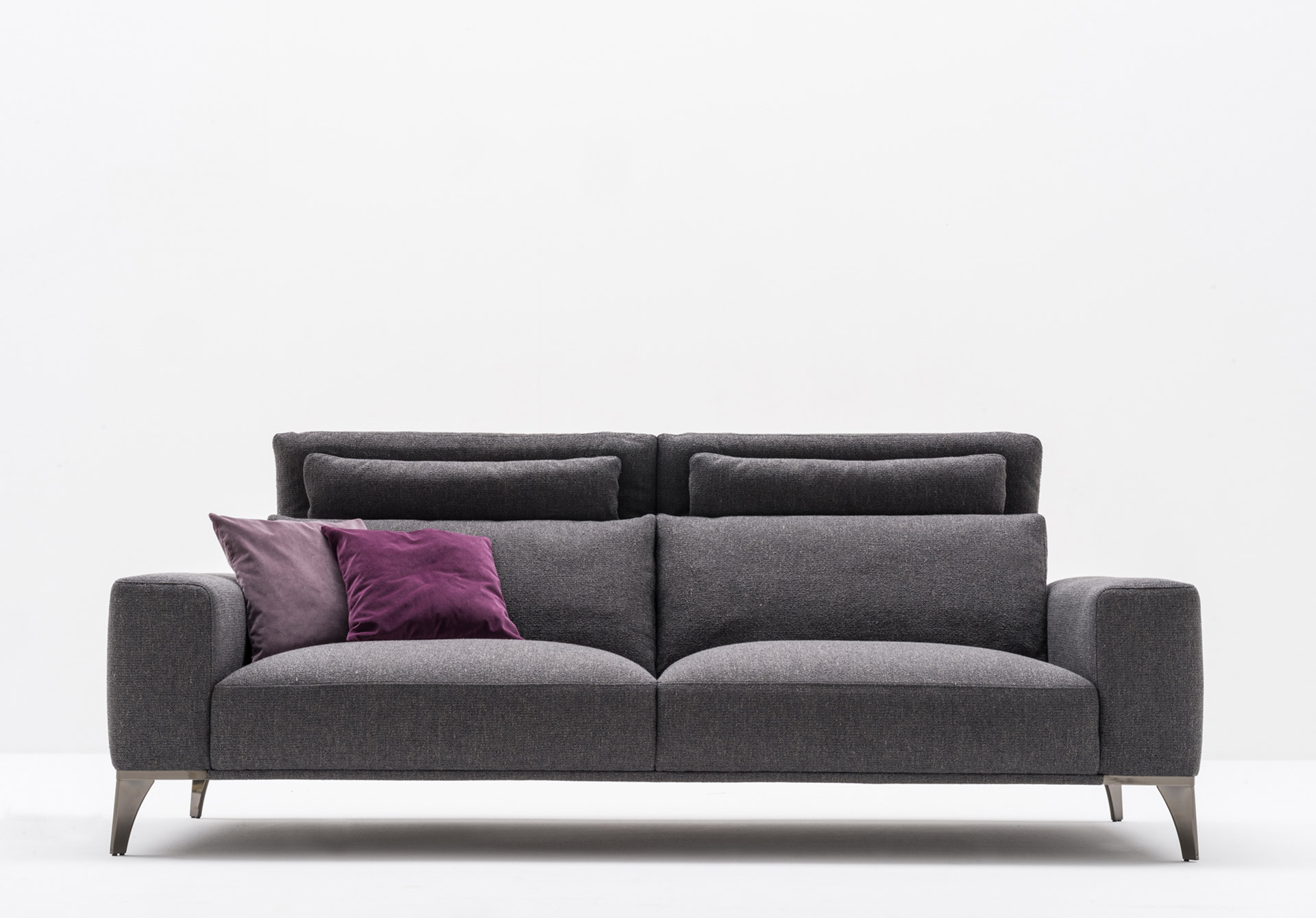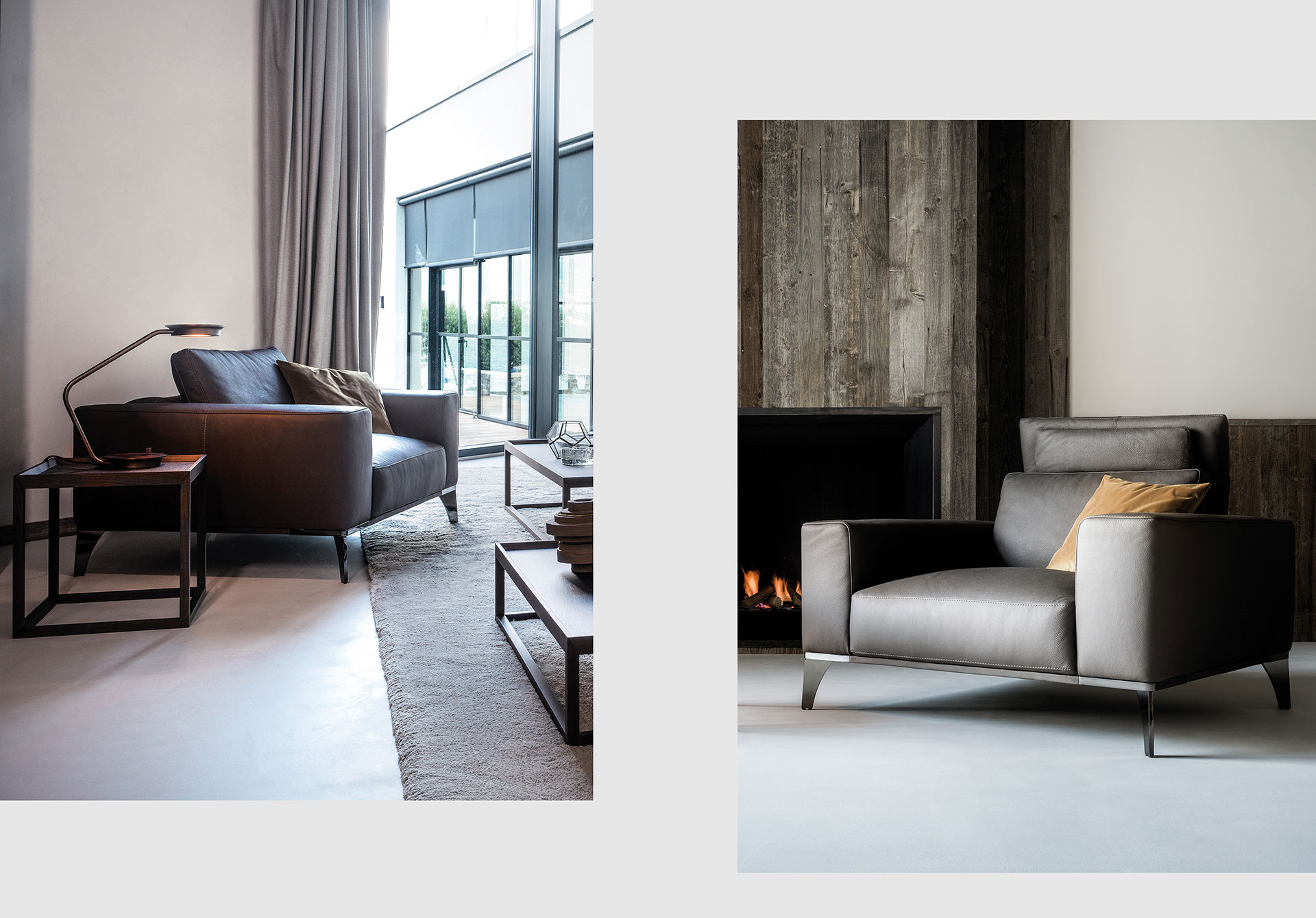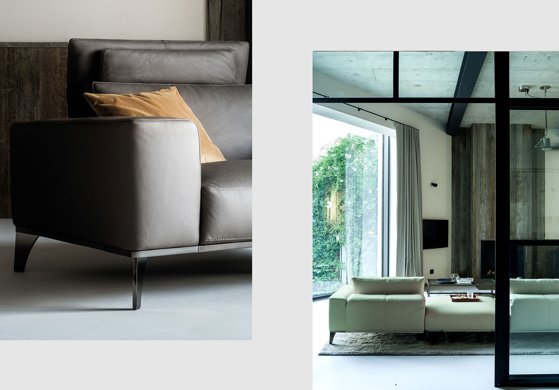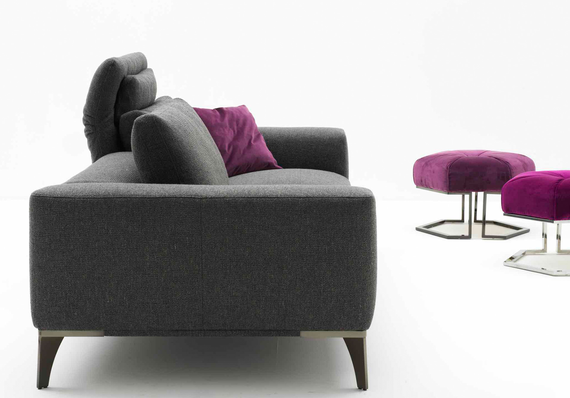A collection of elements for different solutions: sophisticated with a closed backrest for more traditional comfort and protagonist with an open backrest for a more relaxing position. In leather or fabric, it maintains its elegance on a slender metal structure. A collection of sofas with a two-position backrest, an exclusive system for an elegant and vainly suspended model on a light structure with metal feet. Rigorous and safe in leather, soft and enveloping in fabric.