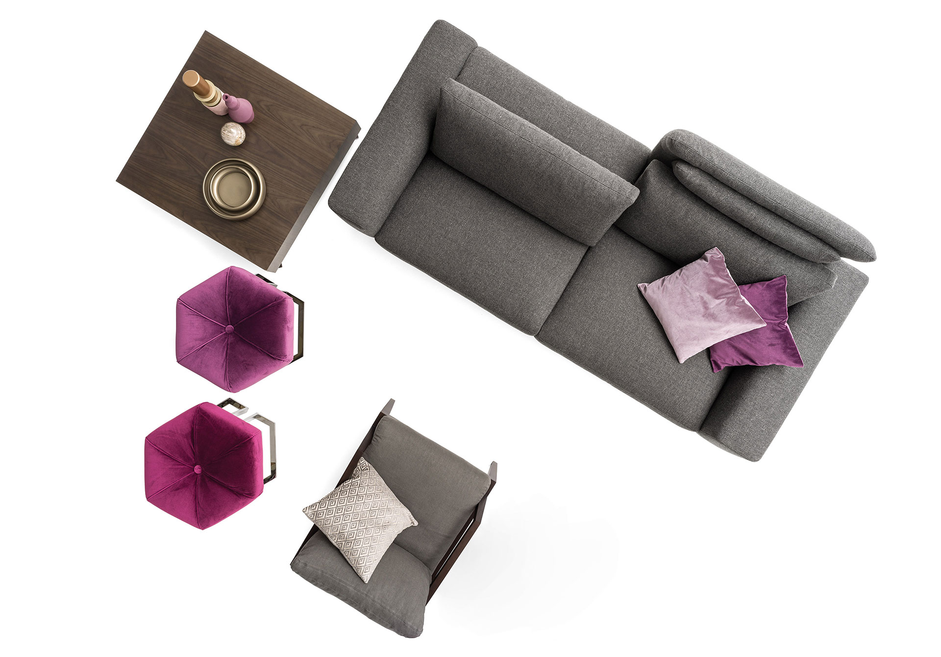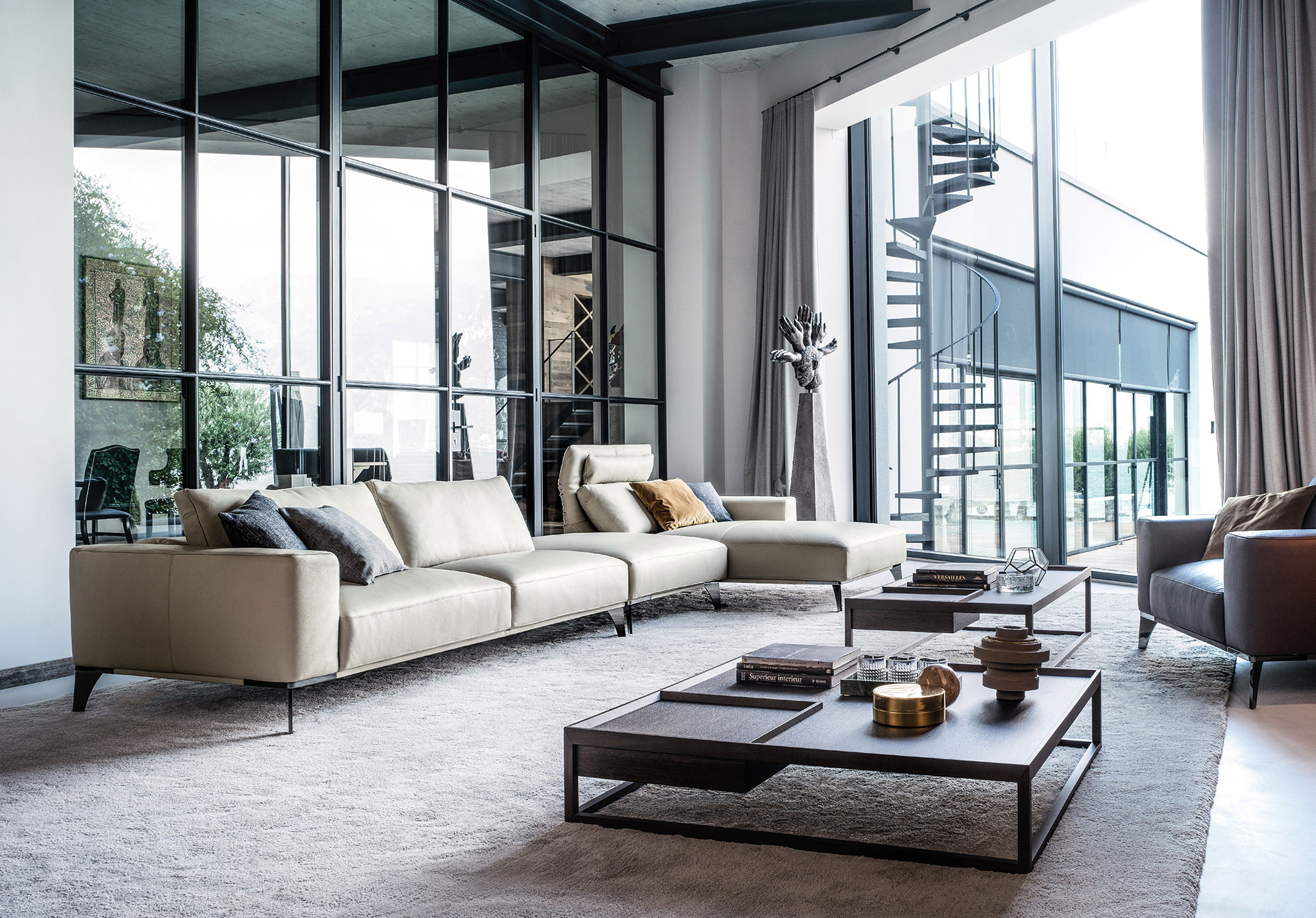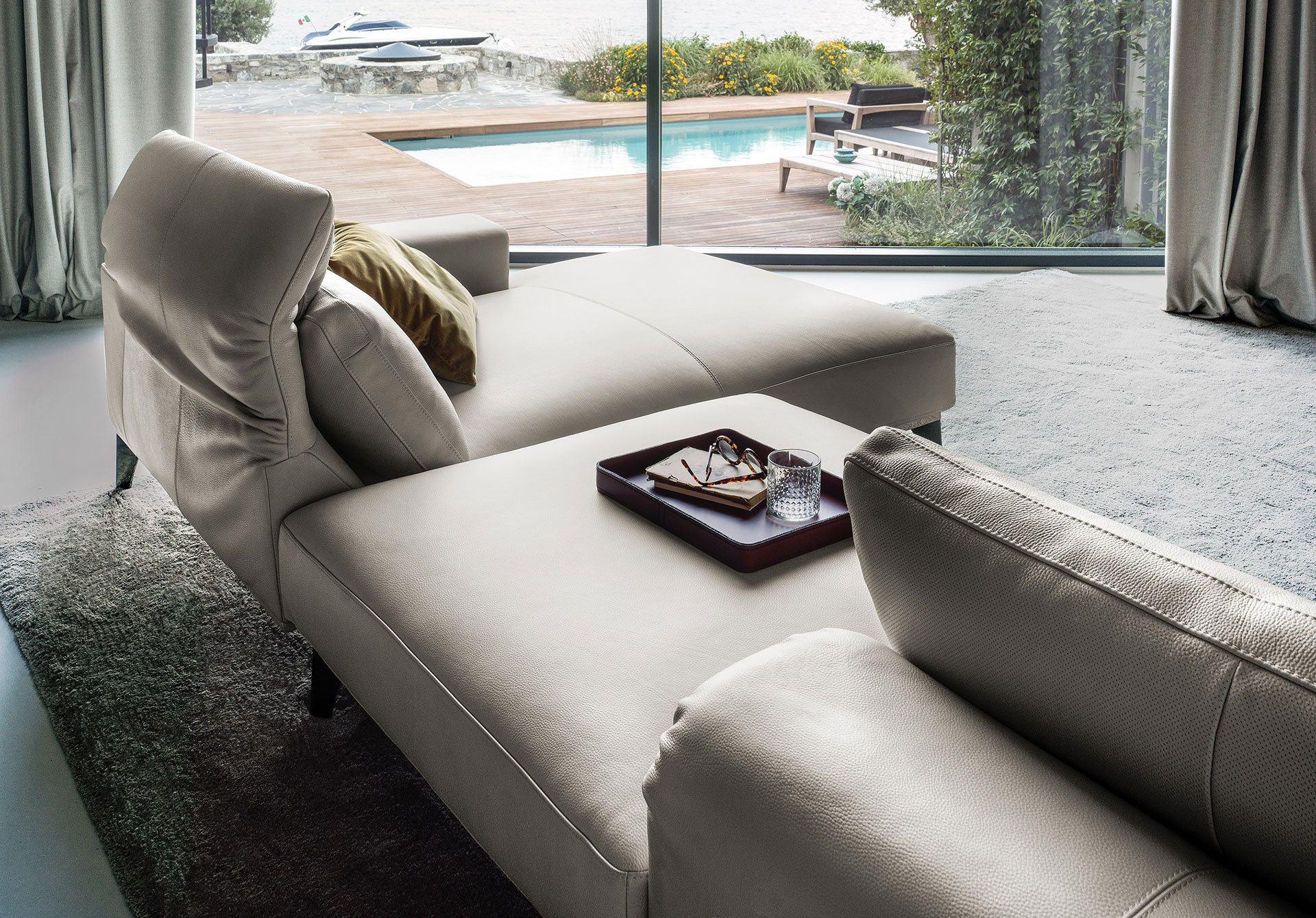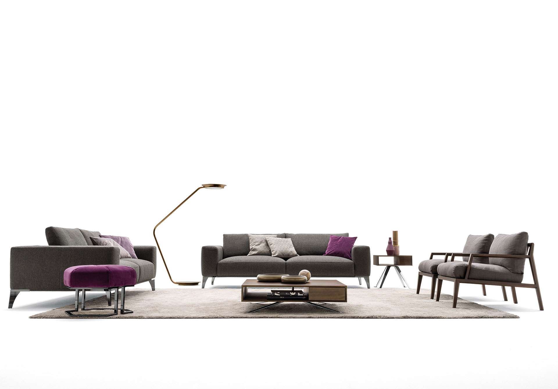 A collection of elements for different solutions: sophisticated with a closed backrest for more traditional comfort and protagonist with an open backrest for a more relaxing position. In leather or fabric, it maintains its elegance on a slender metal structure. A collection of sofas with a two-position backrest, an exclusive system for an elegant and vainly suspended model on a light structure with metal feet. Rigorous and safe in leather, soft and enveloping in fabric.