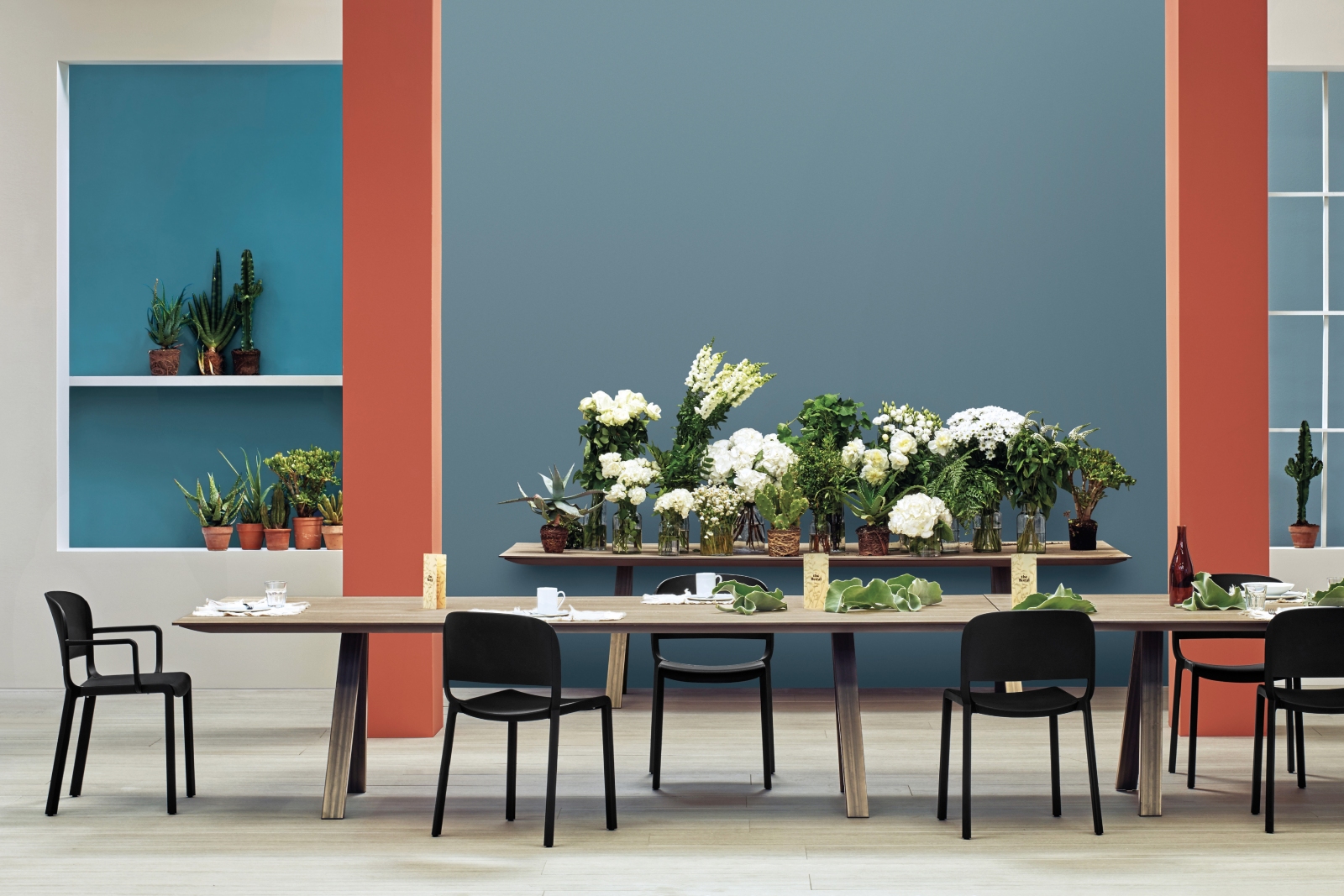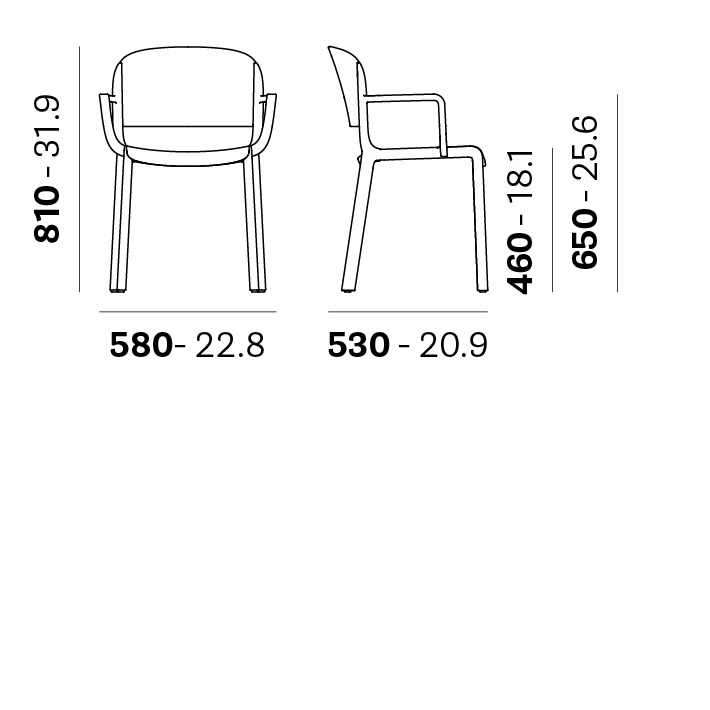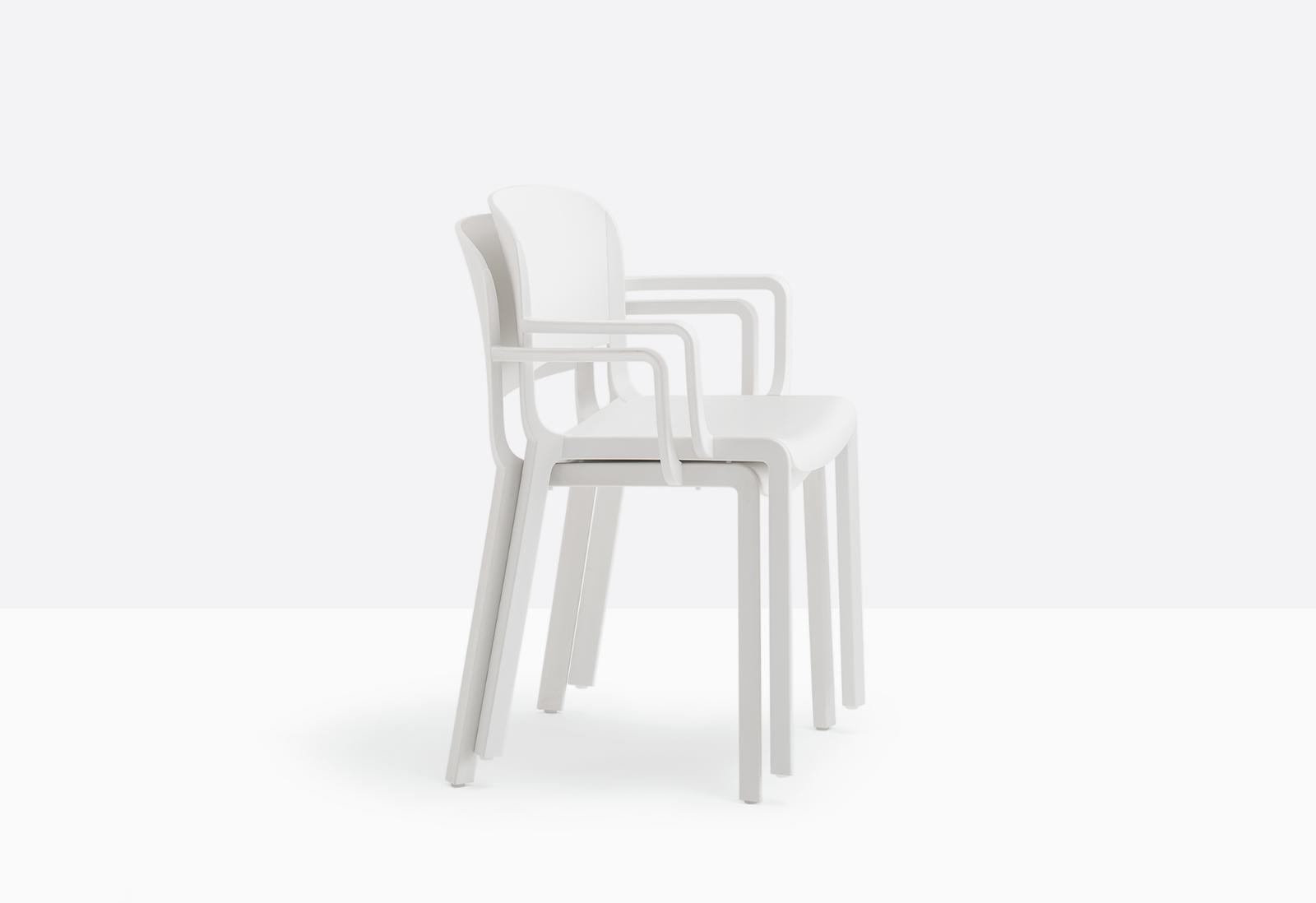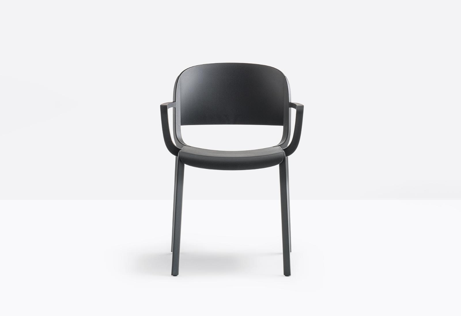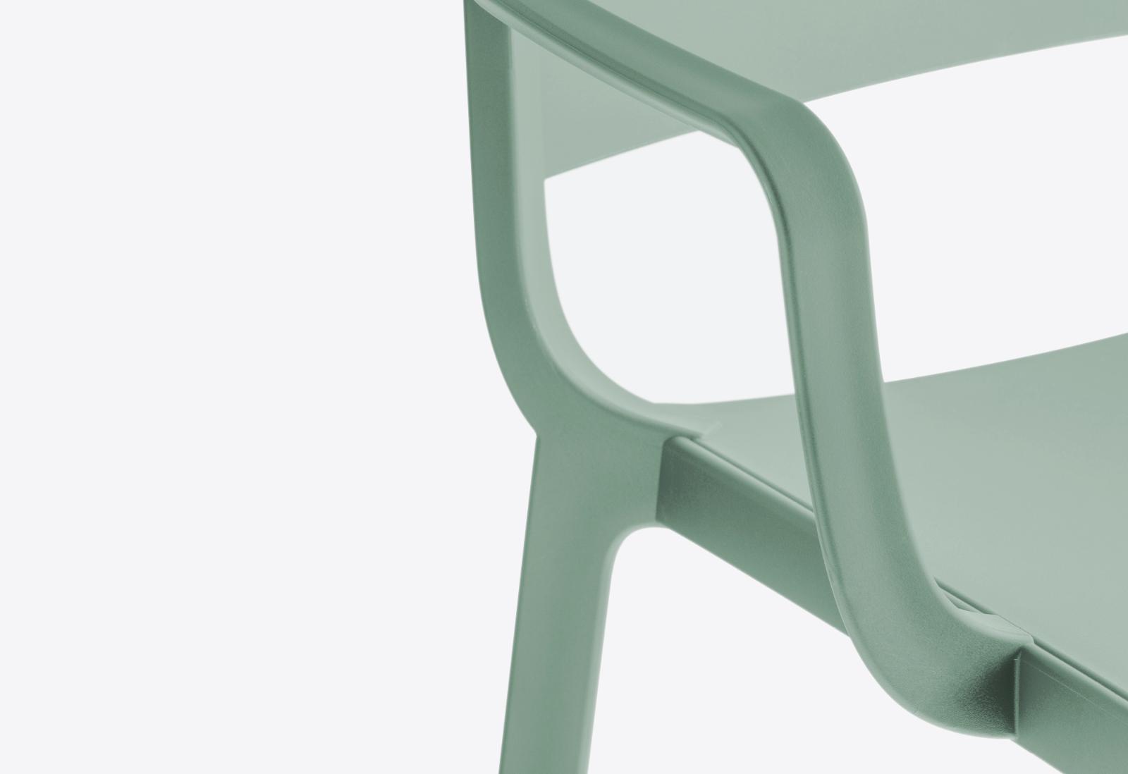 Dome is a collection of chairs that evokes the glorious tradition of bistro chairs with arched silhouettes and the generous shapes of the domes of monuments that embellish many cities in the world. Injection-moulded polypropylene armchair charged with glass fibre featuring delicate details that recall the joints of the wood. Stackable.