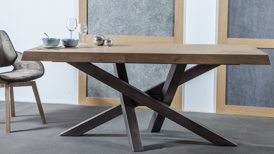 The wooden top dining table Model Flex implement a clear table surface, and a classic and artistic wood supports base The unique design will add a warm feel to your dining space.