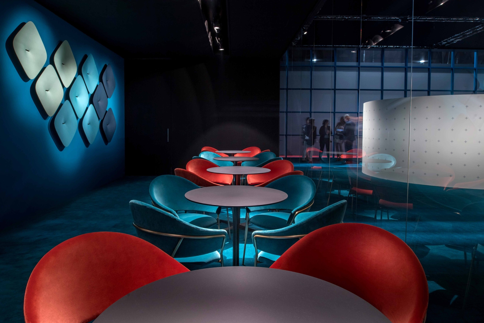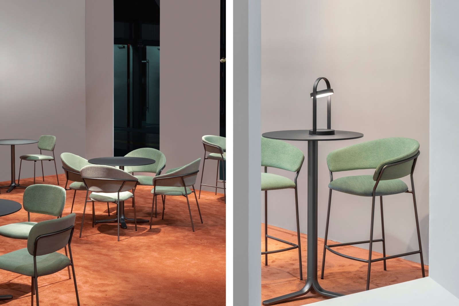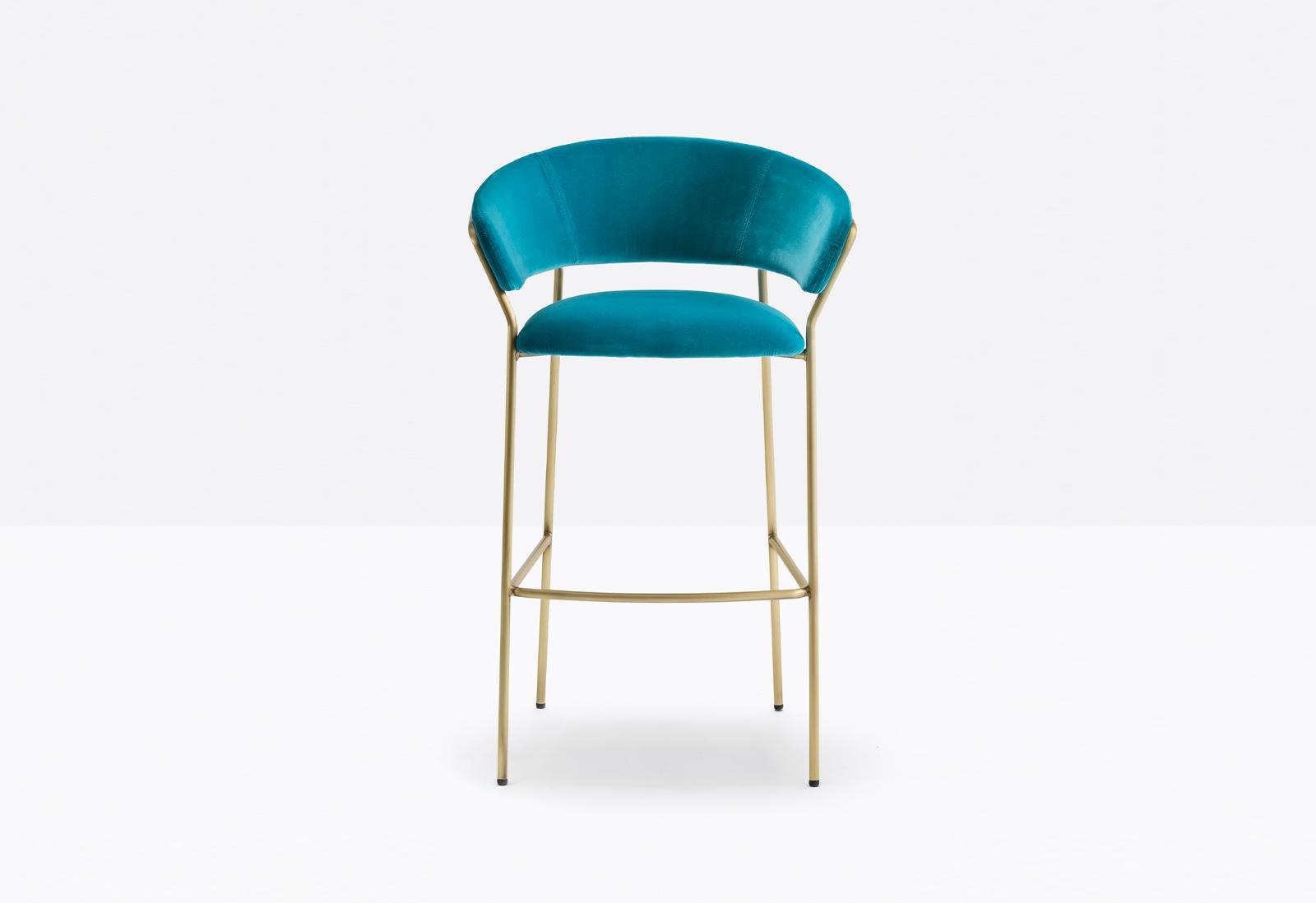 Harmony of shapes, ergonomics and elegance are the characteristics of the Jazz stool. The seat and the curved backrest are supported by a light steel structure. Personalization is ensured by the combination of the upholstery, in fabric or simil leather, and different steel finishes.