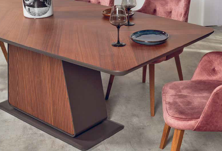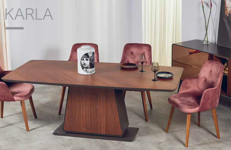 Karla dining table of high aesthetics that will give a renewed and modern atmosphere to the space. Wishbone slab veneer top and colum base in different wood colors.