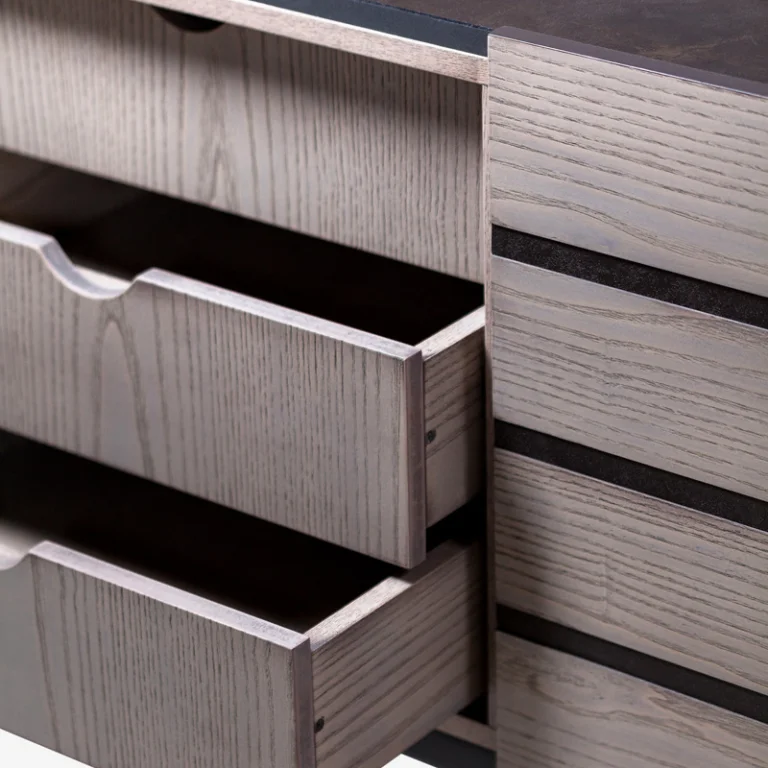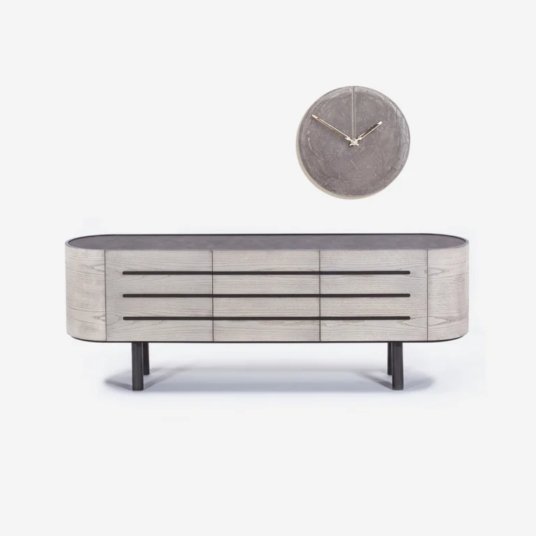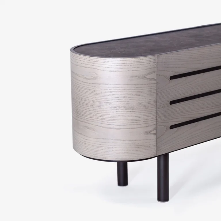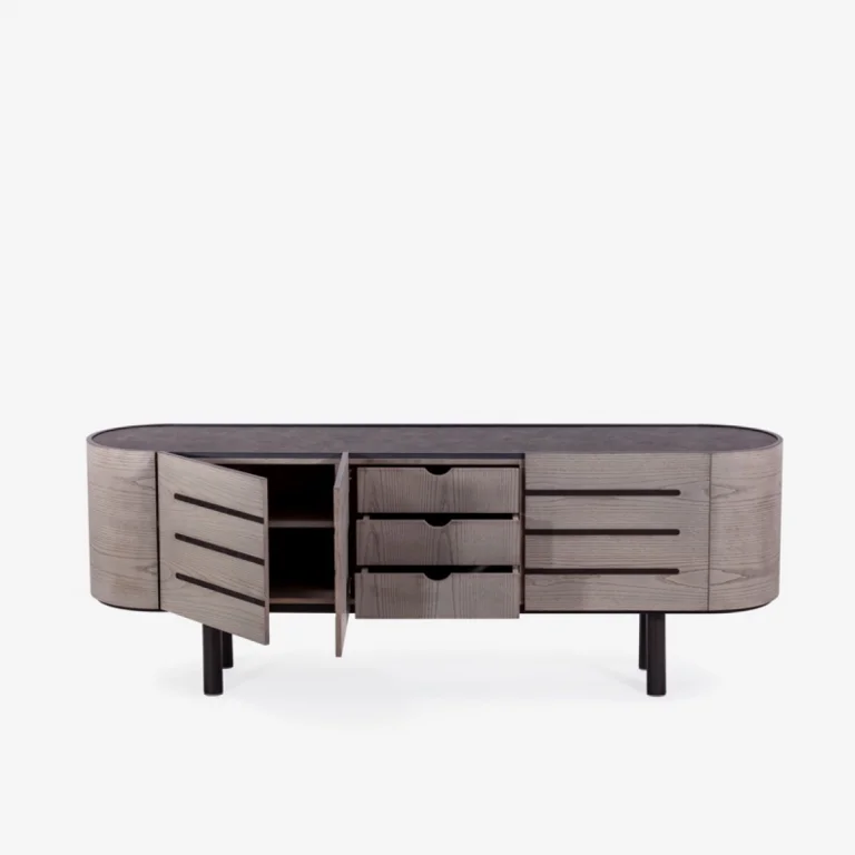 A highly original and easy-to-use sideboard due to its capacity, which will highlight your space and become your ally in clutter. Curves, metals and lacquer are harmoniously linked with oak and anti-scratch surfaces, highlighting a piece of furniture that will catch the eye both for its original design and its quality.