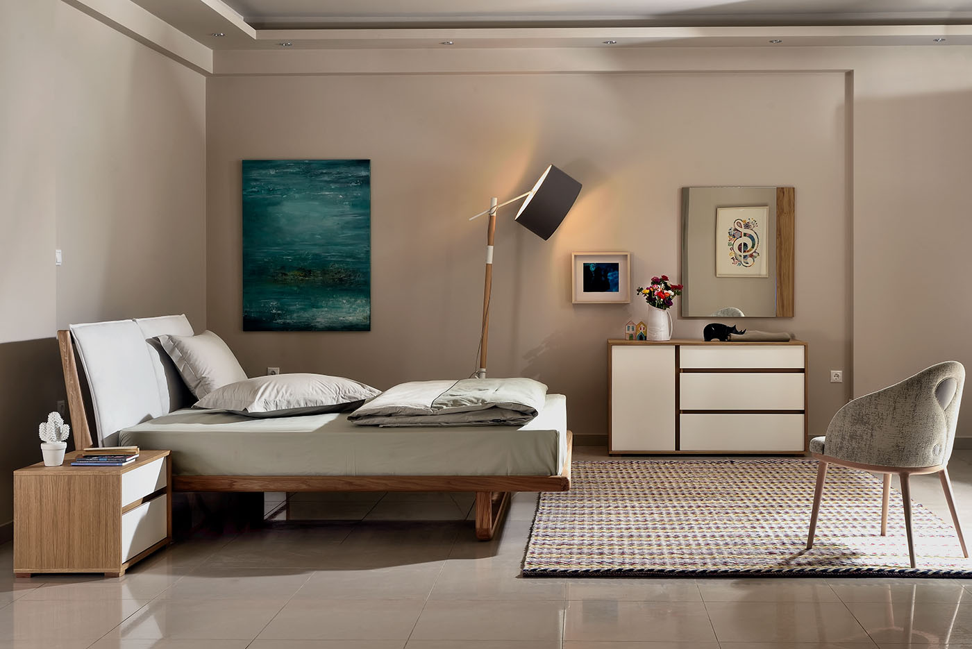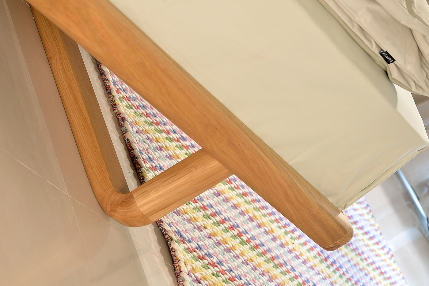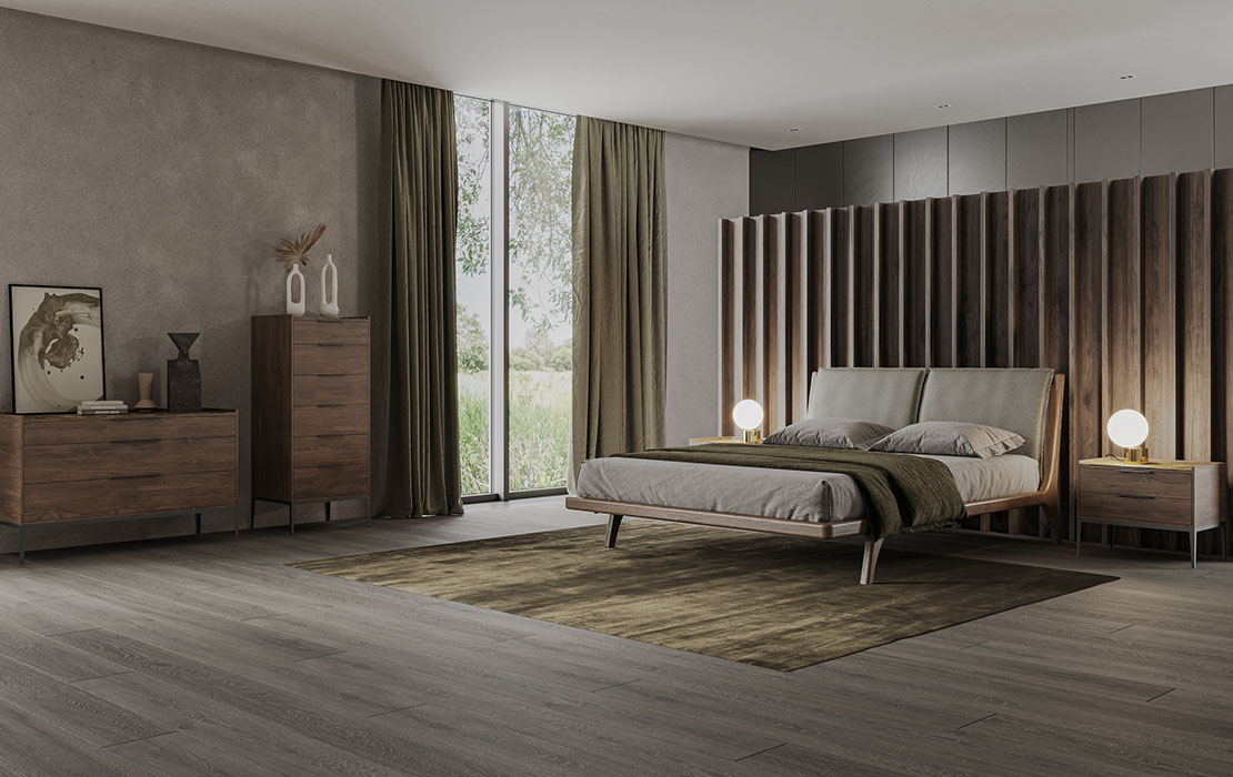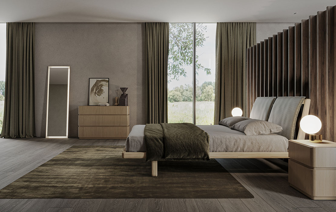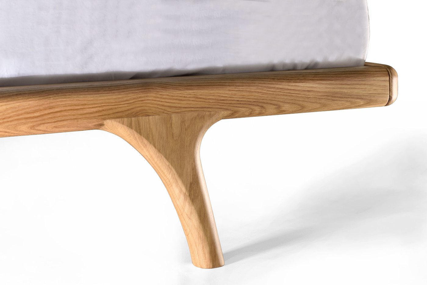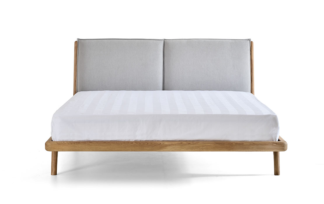 Bed with solid wood frame with curved edges and upholstery in two curved pieces.