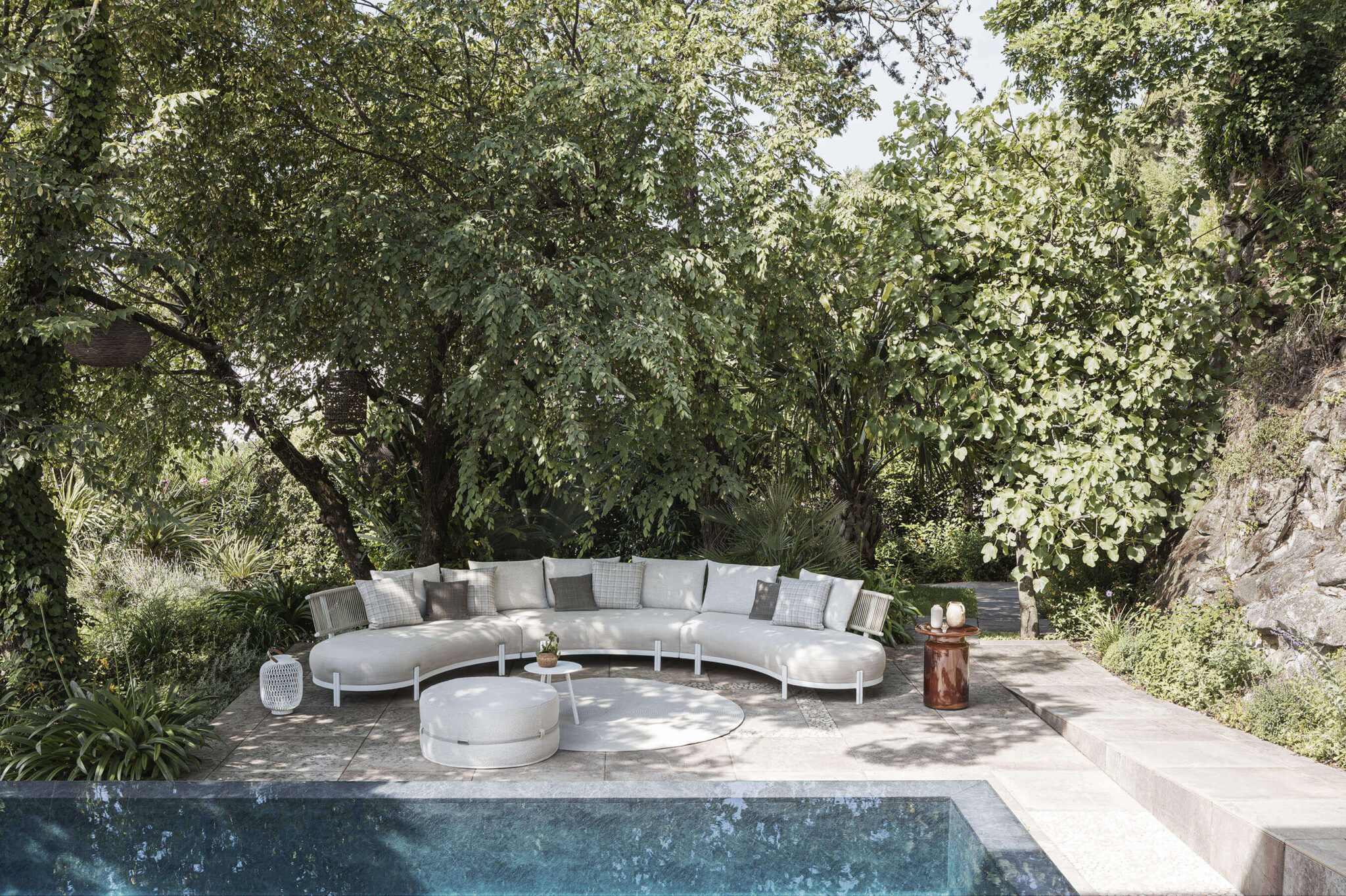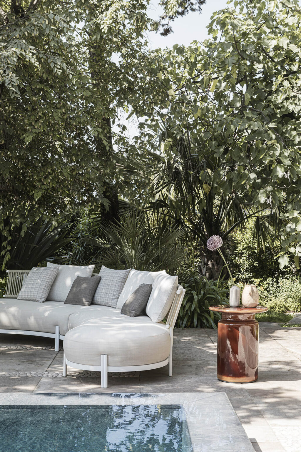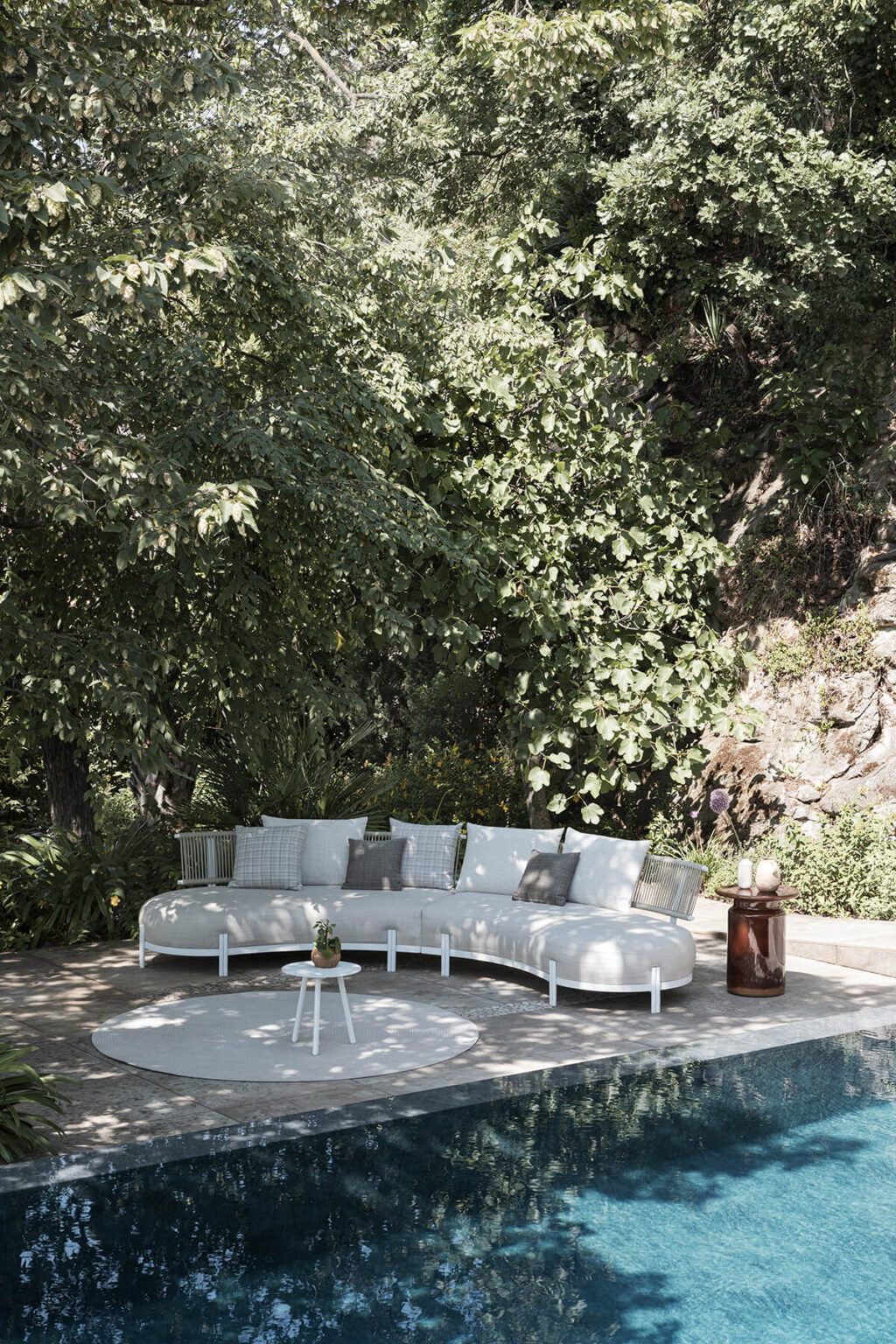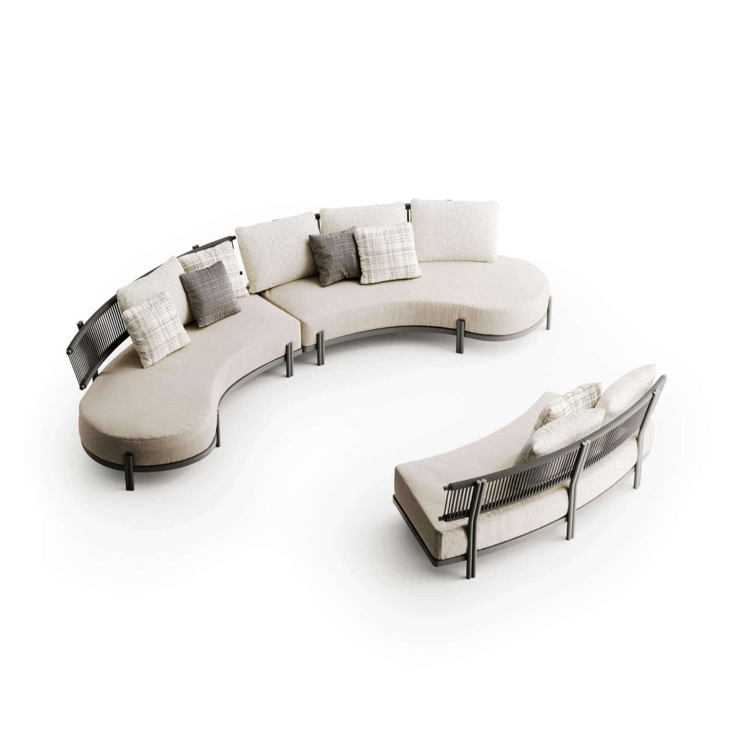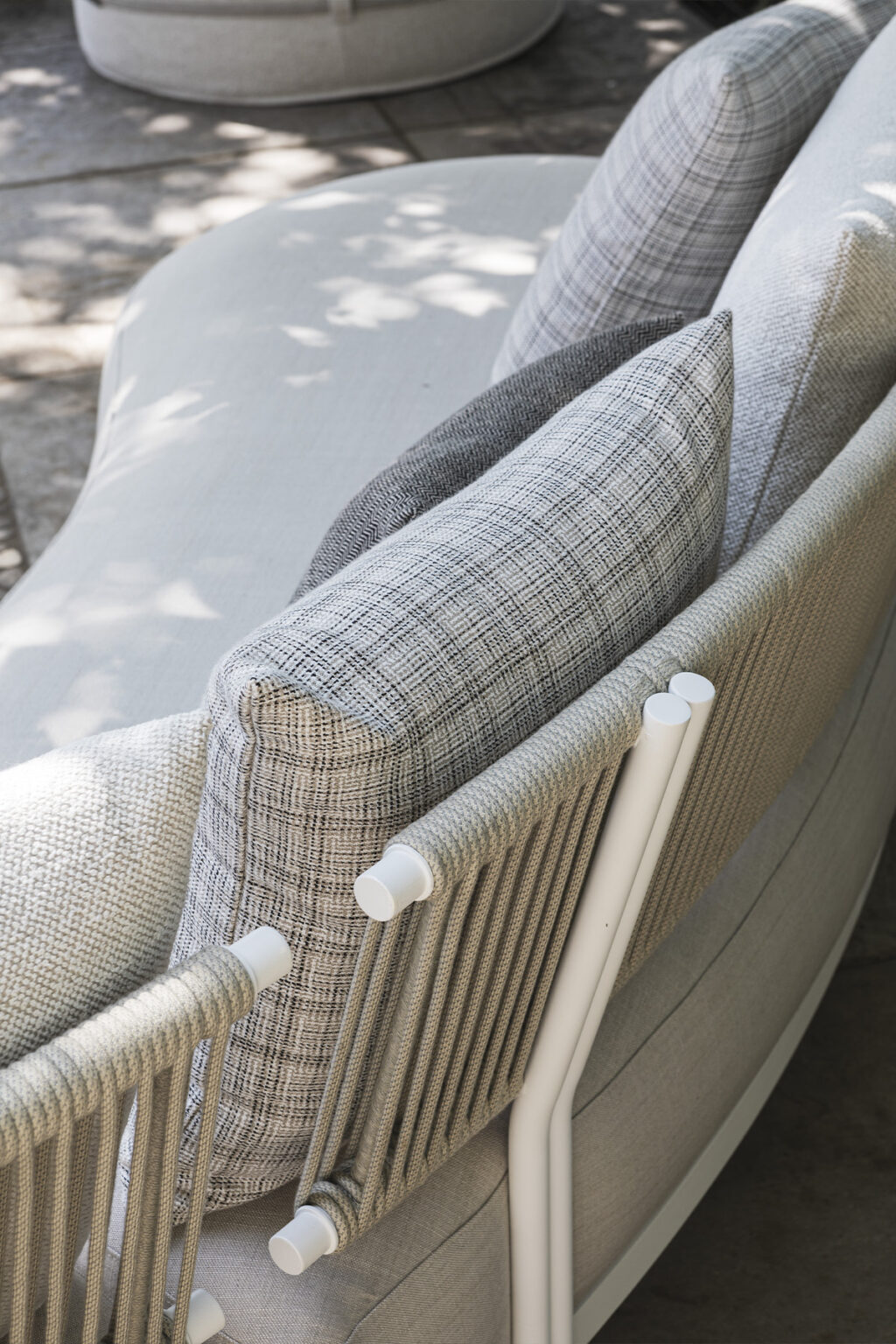 A solid, powder coated aluminium frame is coupled with acrylic rope, hand-weaved and weather-resistant.The soft and refined appeal of the materials is combined with the sinuous and delicate shapes of the Loto modular sofa, giving the room a special and unique touch.