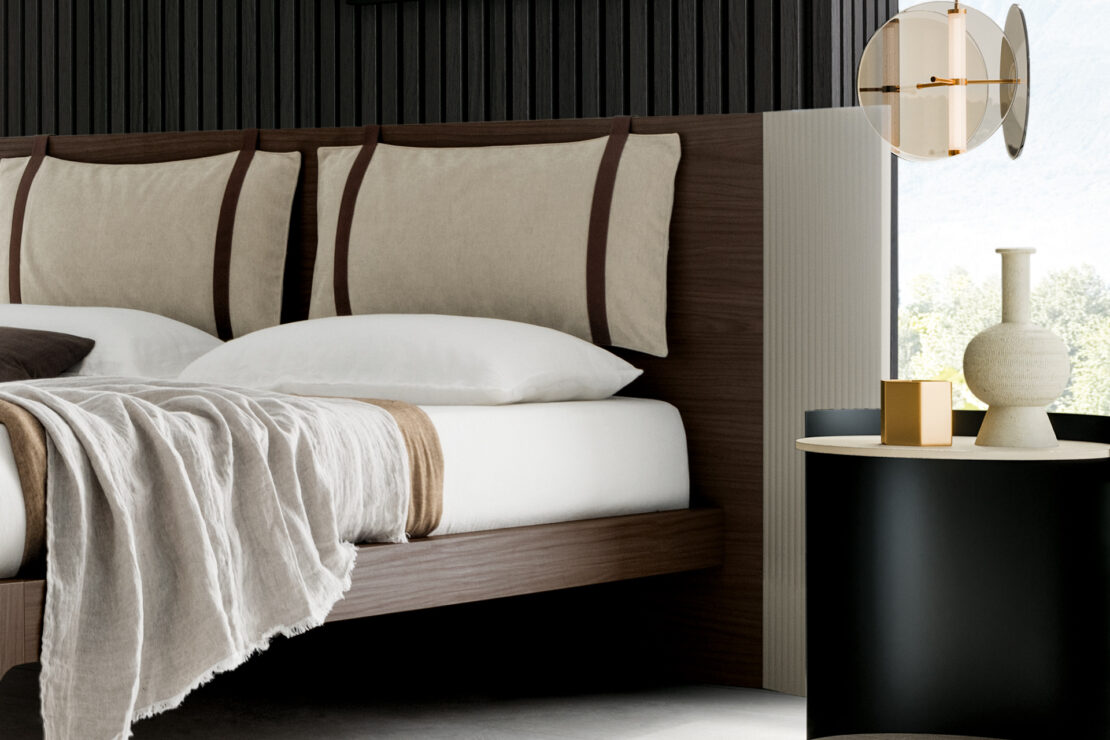 Maistro Product Information Maistro bed The headboard has two side wings attached: they can be fixed at a pre-set minimum angle or assembled in line.The two eco-leather or fabric cushions on the headboard double the relaxation. Each to their own comfort.