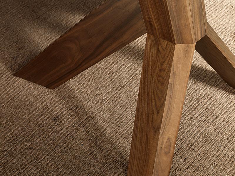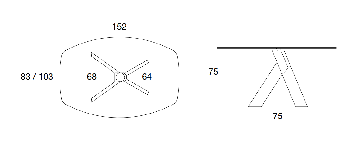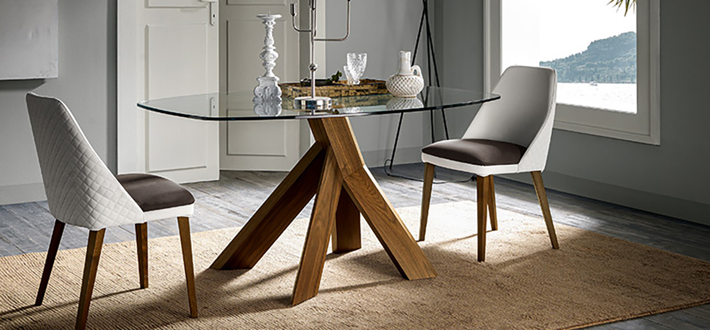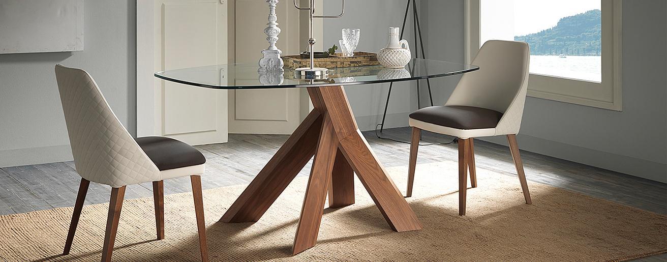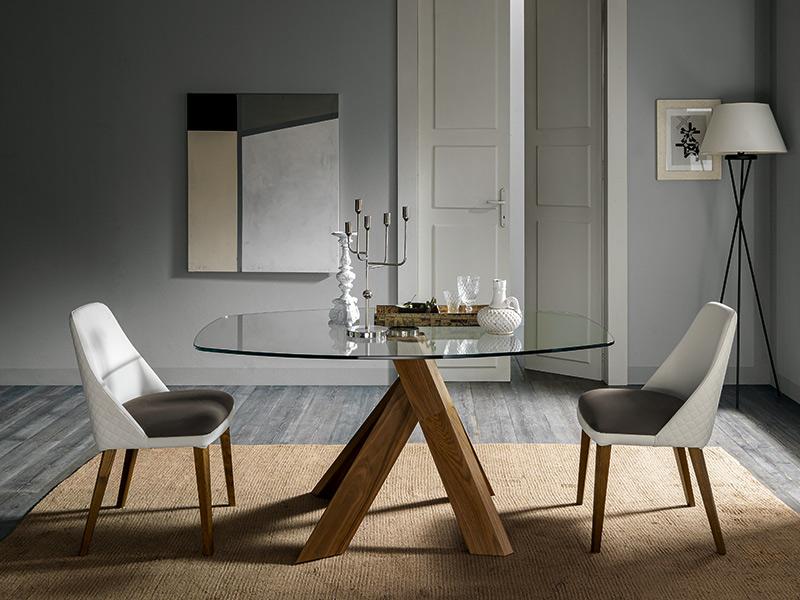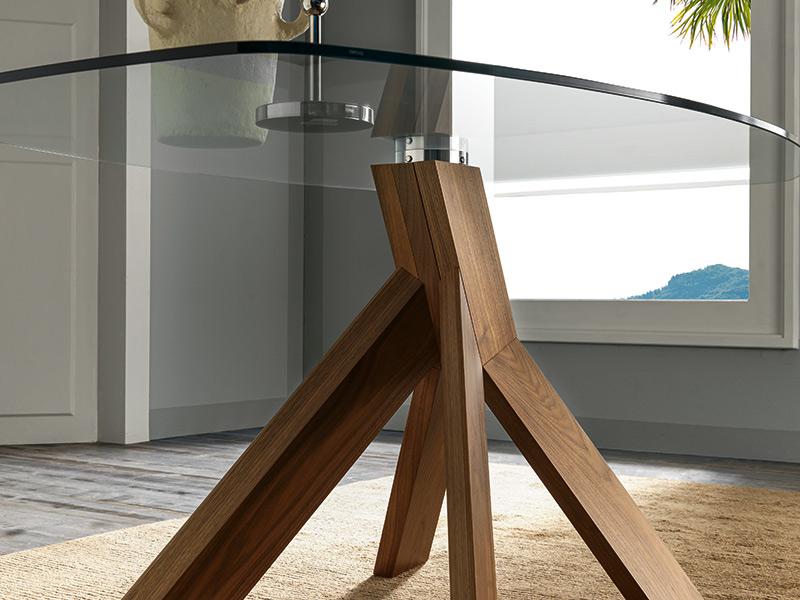 Table with 4 legs base in wood or metal powder coated. Barrel shaped top clear tempered glass.