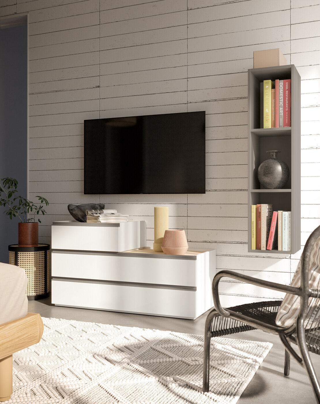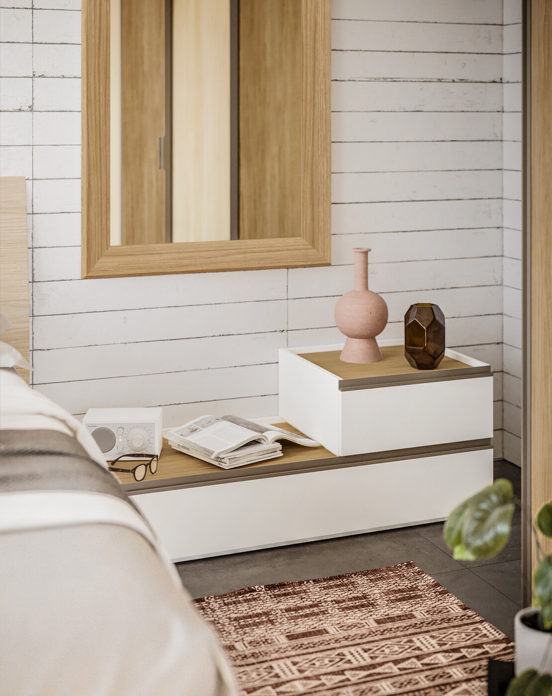 A modular range with a variety of forms and finishes that you can choose to suit your setting.With the units in the Modo system, you can create a variety of configurations. One of the advantages of this system is that you can choose the finish you want for the structure, front panels, tops and handles.The groove can be finished to match other items of furniture, like the bed, or to create original combinations.The Modo system offers a new way of combining functionality with aesthetics. Its modular construction means units can be used