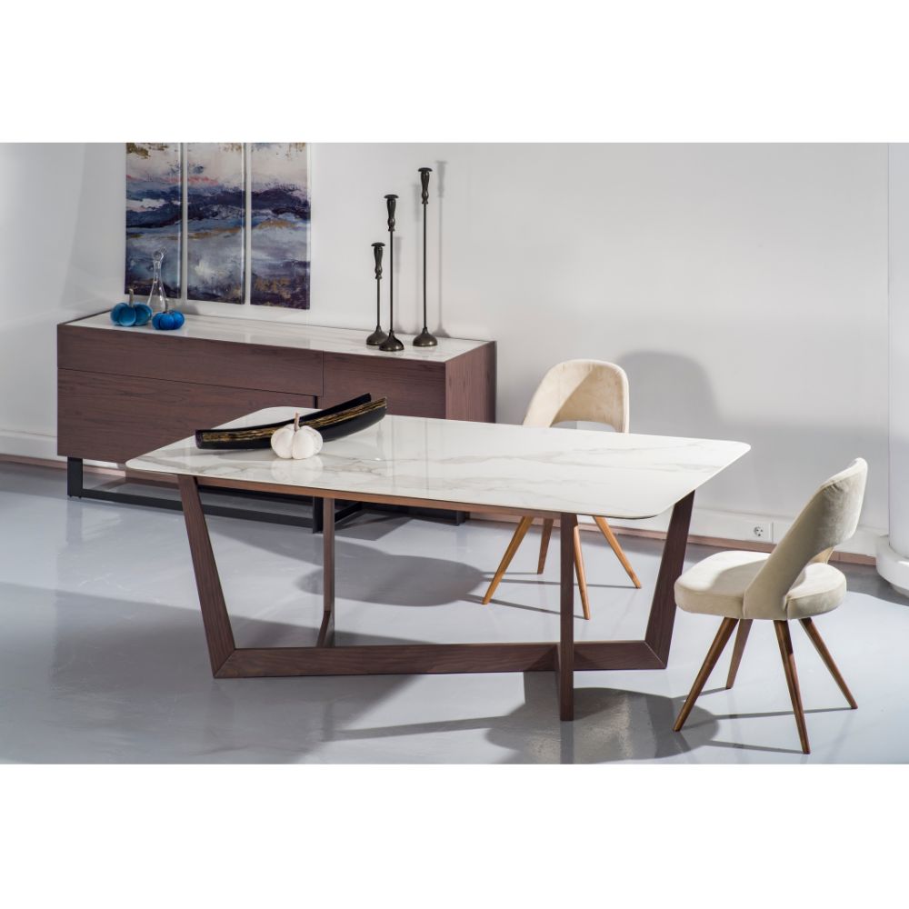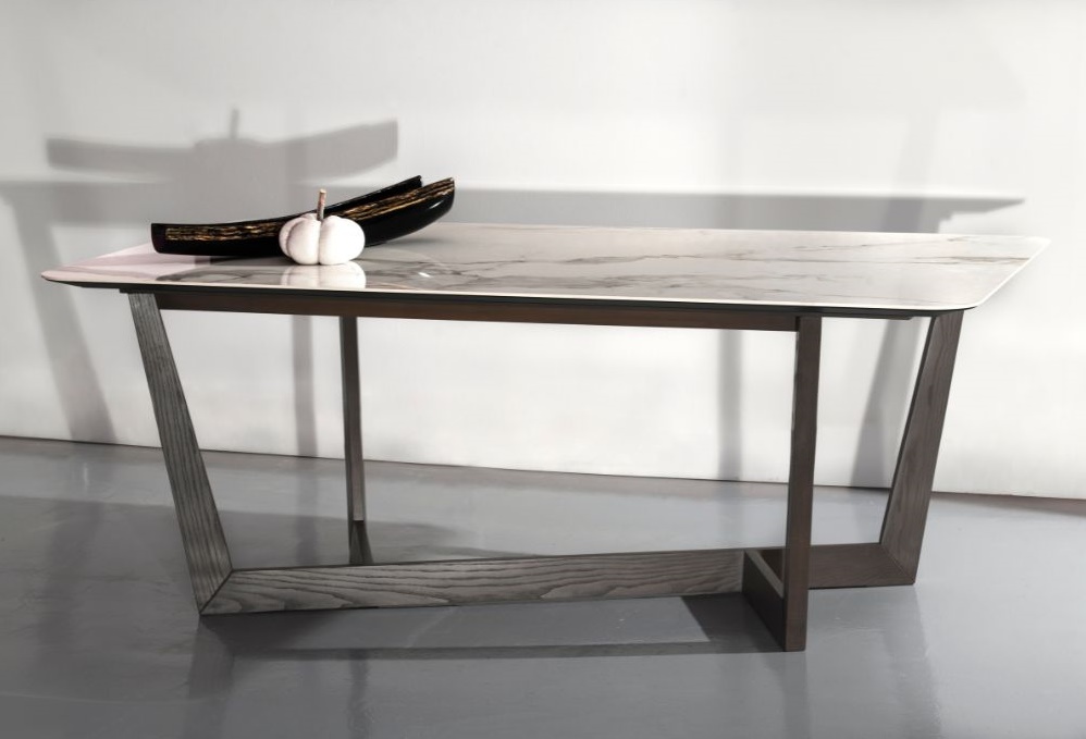 Netword Product Information Modern dining table Model Netword in oak wood with a wooden or ceramic surface . Clean geometric lines on the base that taps down, in a contemporary design. Dimension: 2.00 x 1.00 x 77 h m
