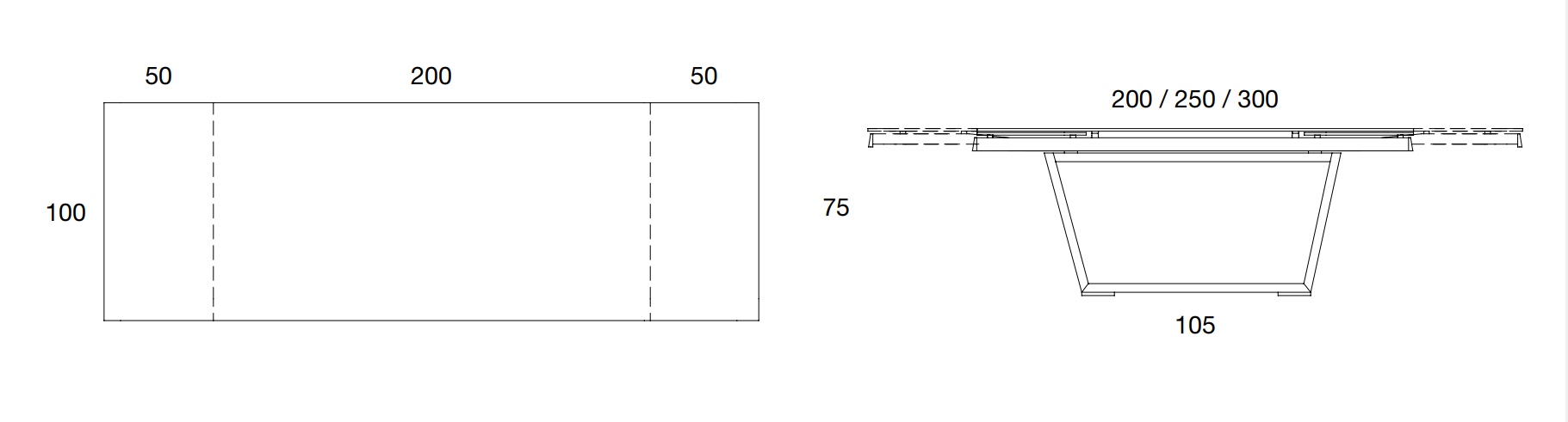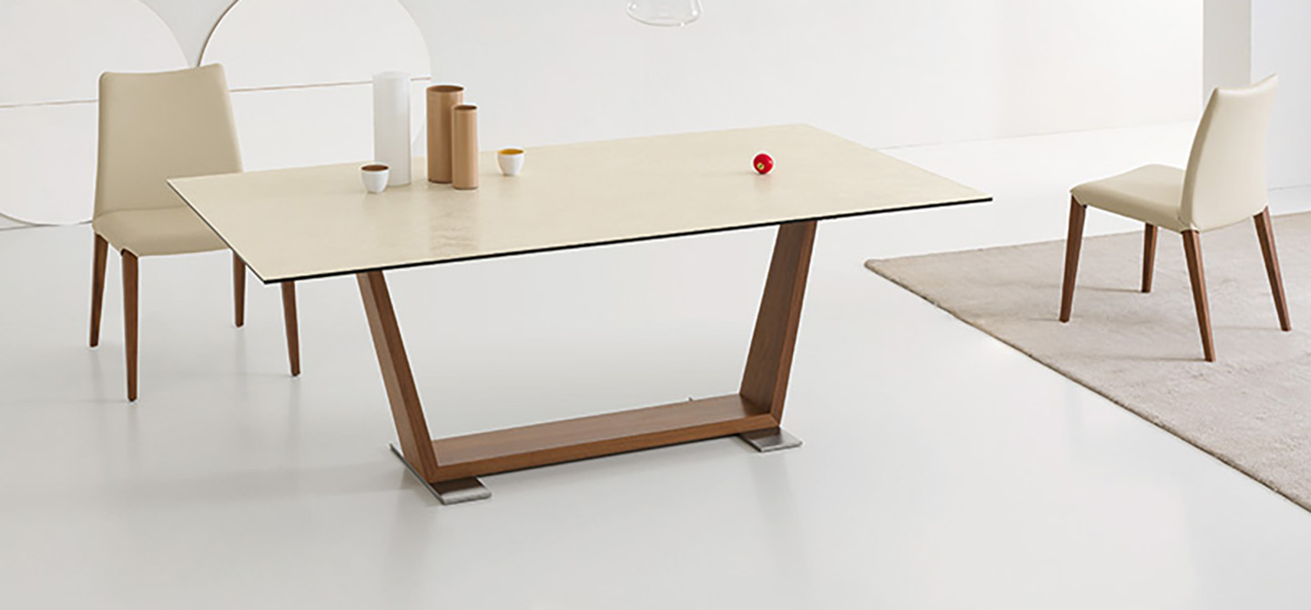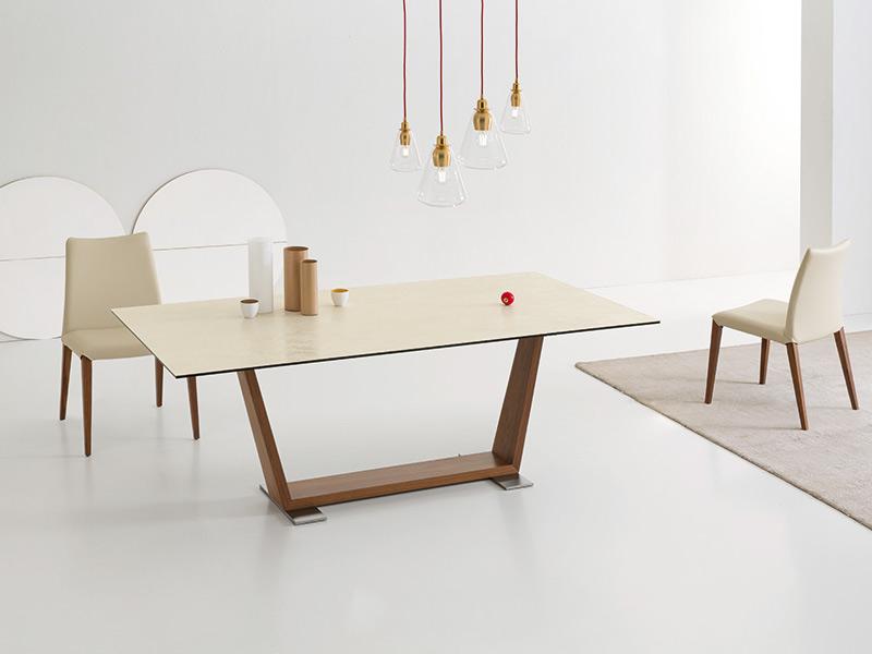 OBLIQUE Product Information Extendable table with wooden base and feet in satin steel. Extendable frame in aluminium. Ceramic top with 2 extensions.