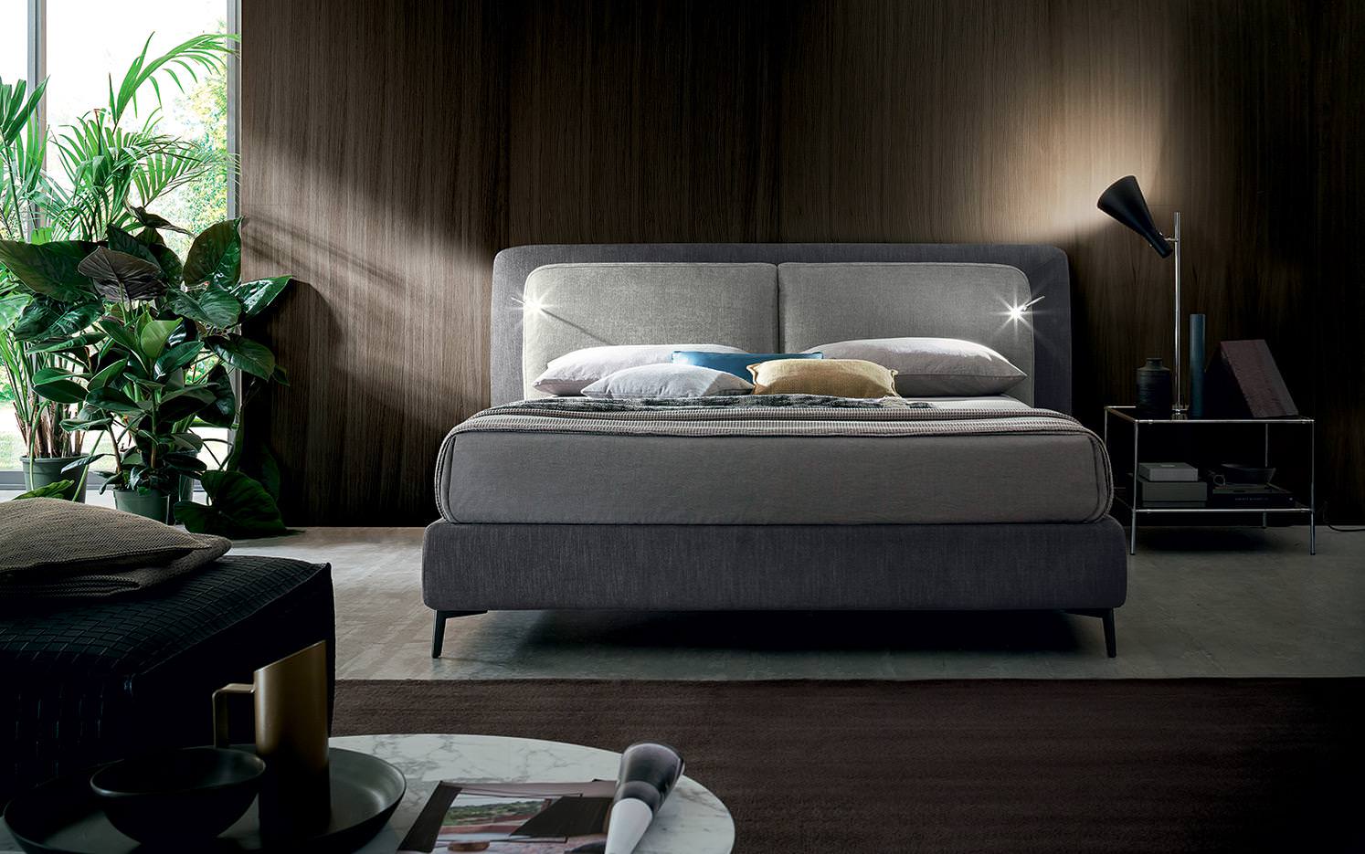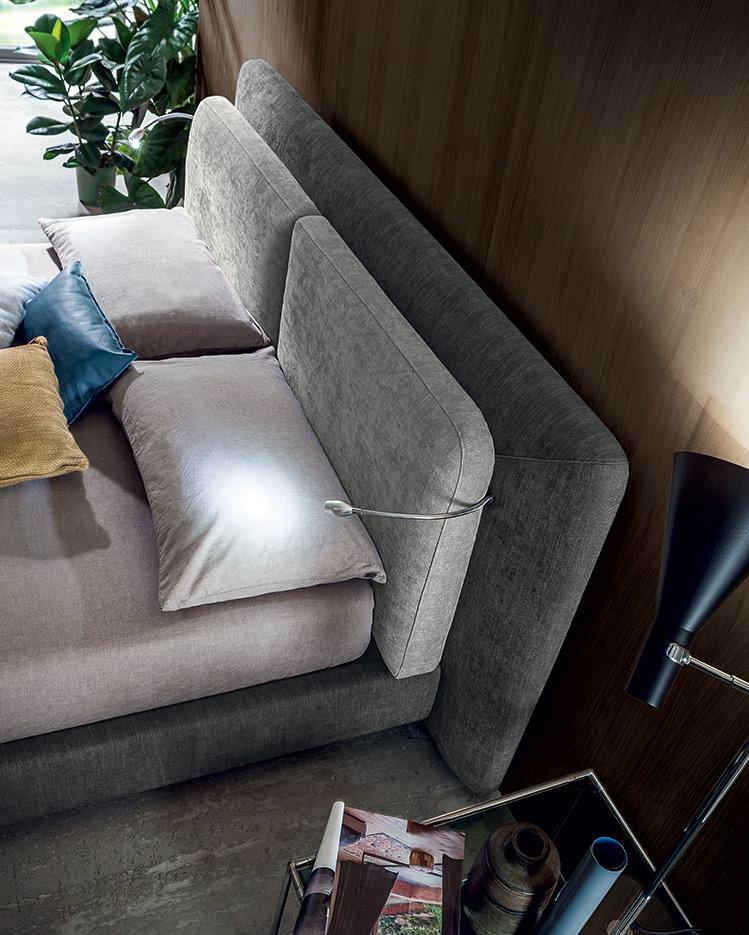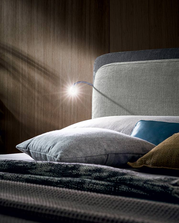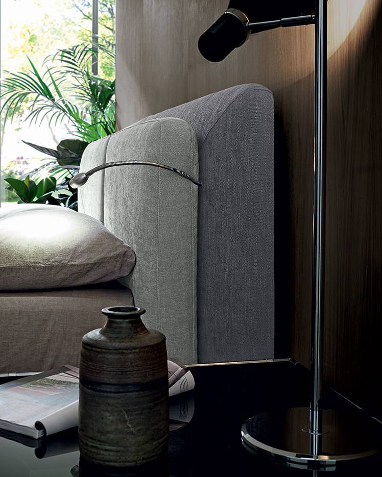 Super soft, comfortable lines. Penny gives you the option to install a tilting LED reading light on the headboard, a convenient practical accessory when you want to relax in the evening with a good book. Penny’s aesthetics are interpreted through softness, with the generously padded headboard enhancing the sense of cosiness.