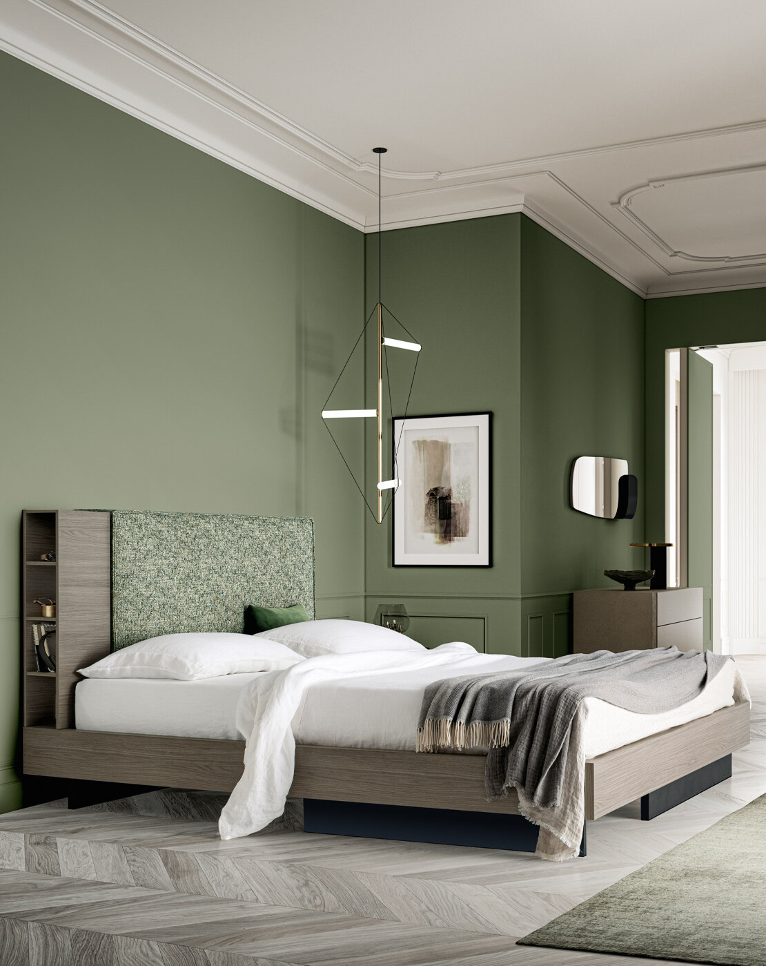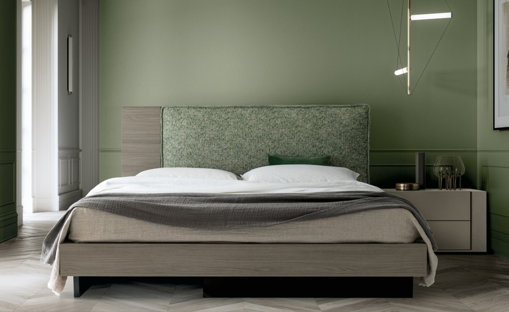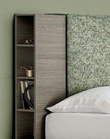 The bed has an original headboard with an open compartment and matt black asymmetrical legs.Plinio was designed for people with a small bedroom space but who don’t want to compromise on the comfort of a large double bed. This bed has a practical open compartment built into the headboard, which replaces the second bedside table, taking up less overall space.