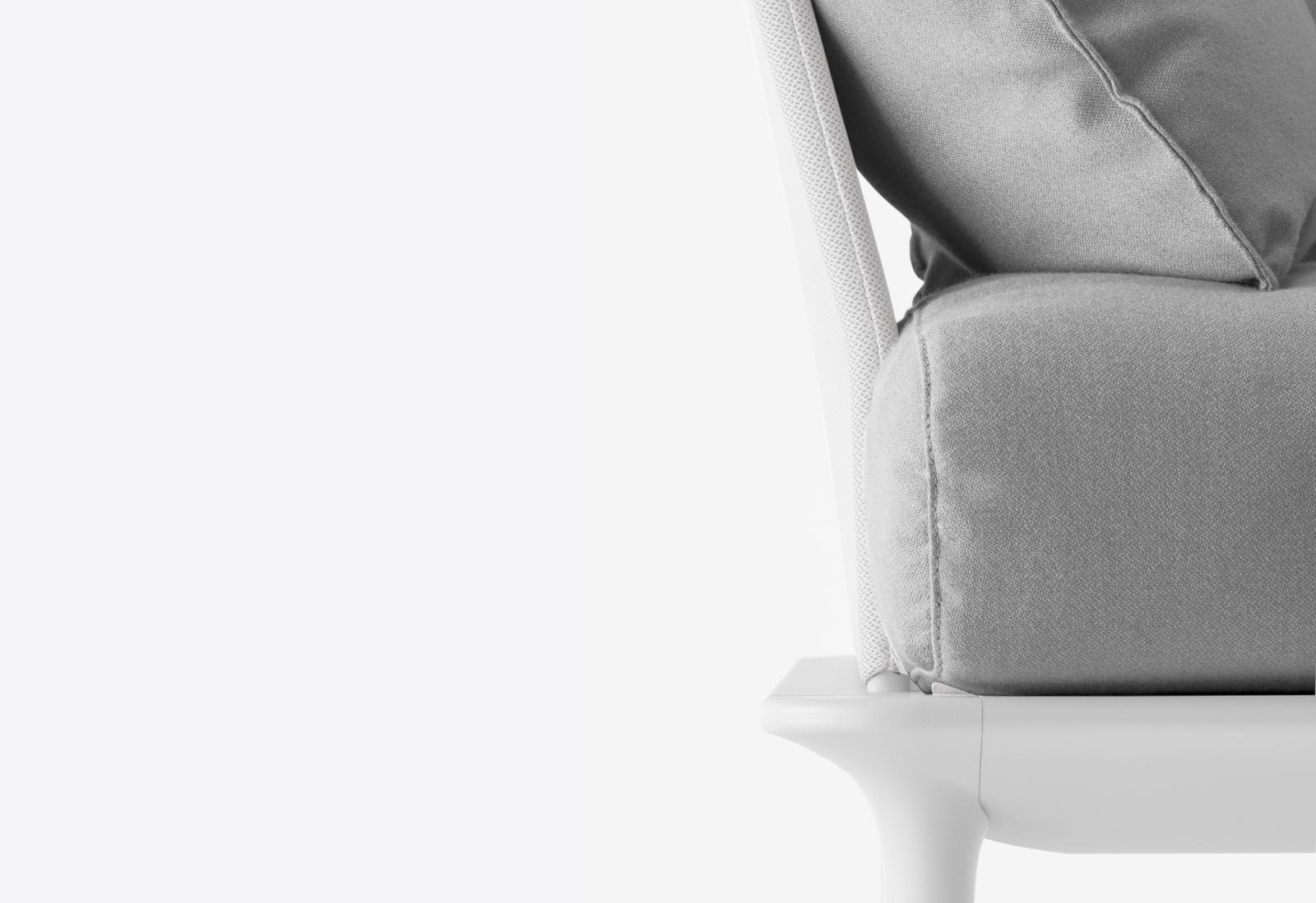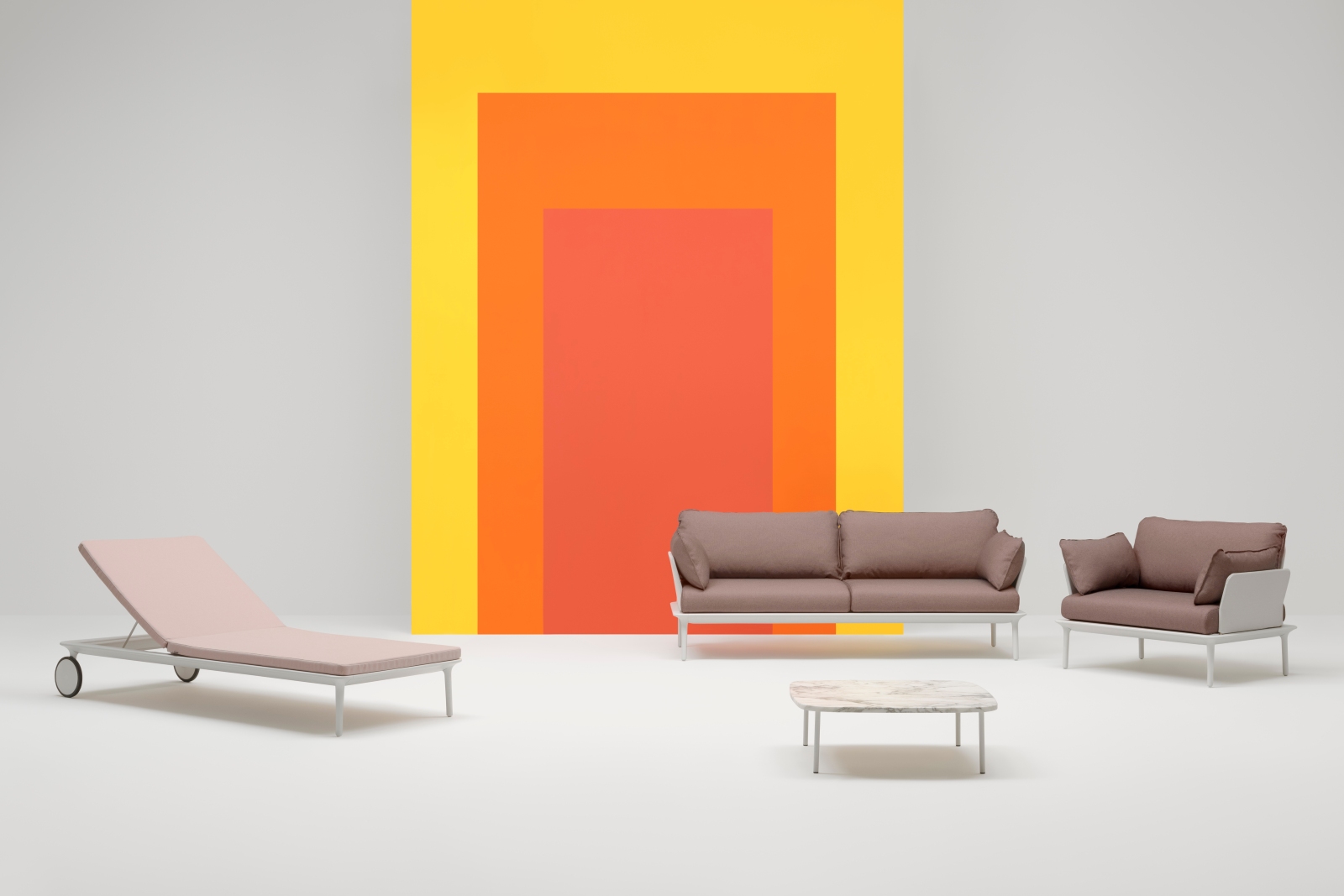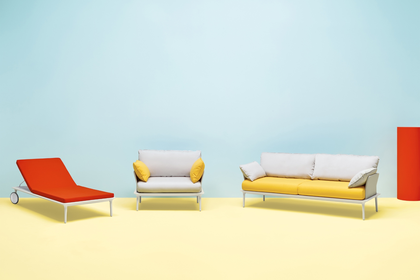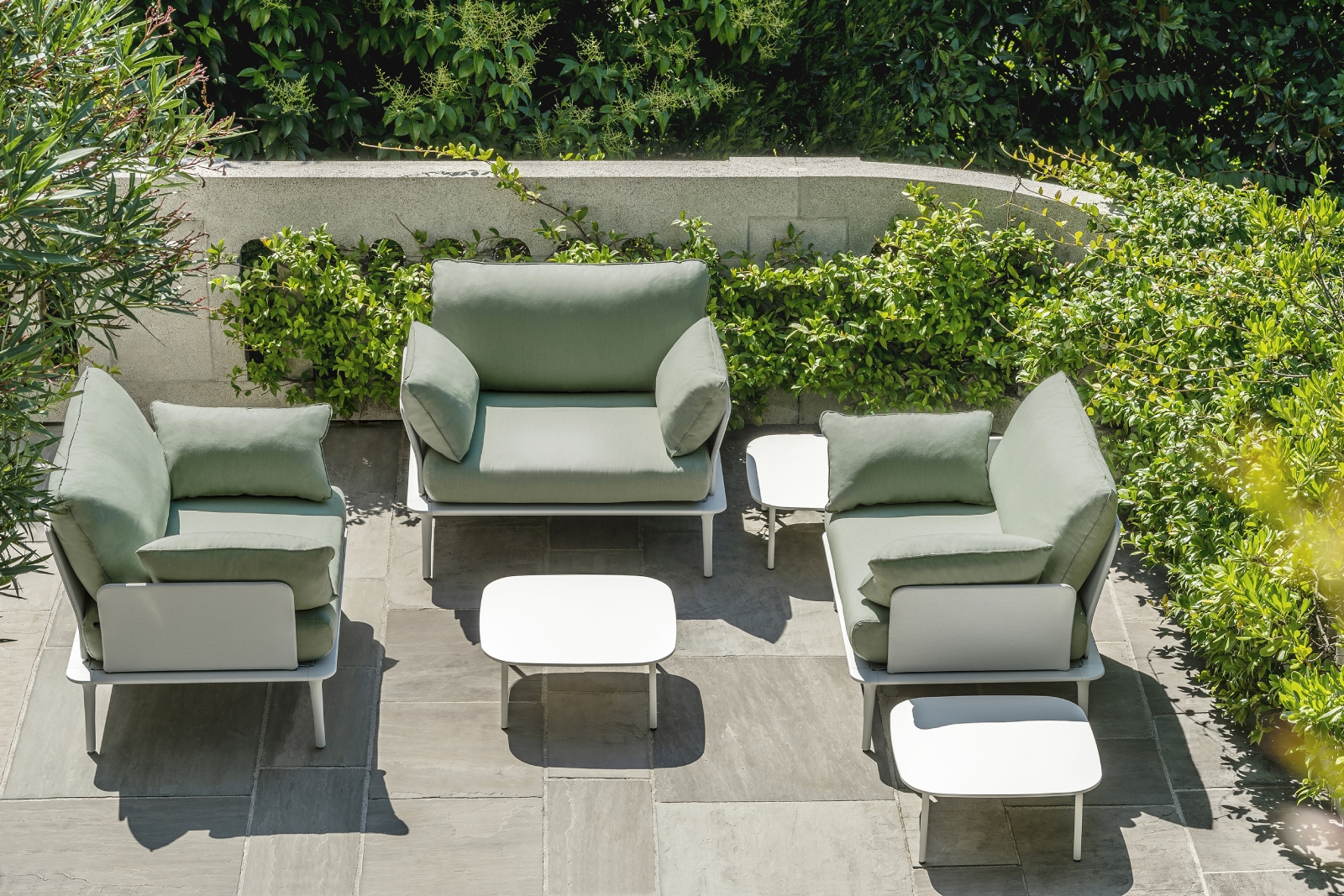 Reva is an outdoor collection with smooth lines and generous sizes. Three-seat sofa with a thin extruded aluminium frame supported by four tapered die-cast aluminium legs that underline its clean design. Cushions in waterproof fabric and polyurethane foam inside.
