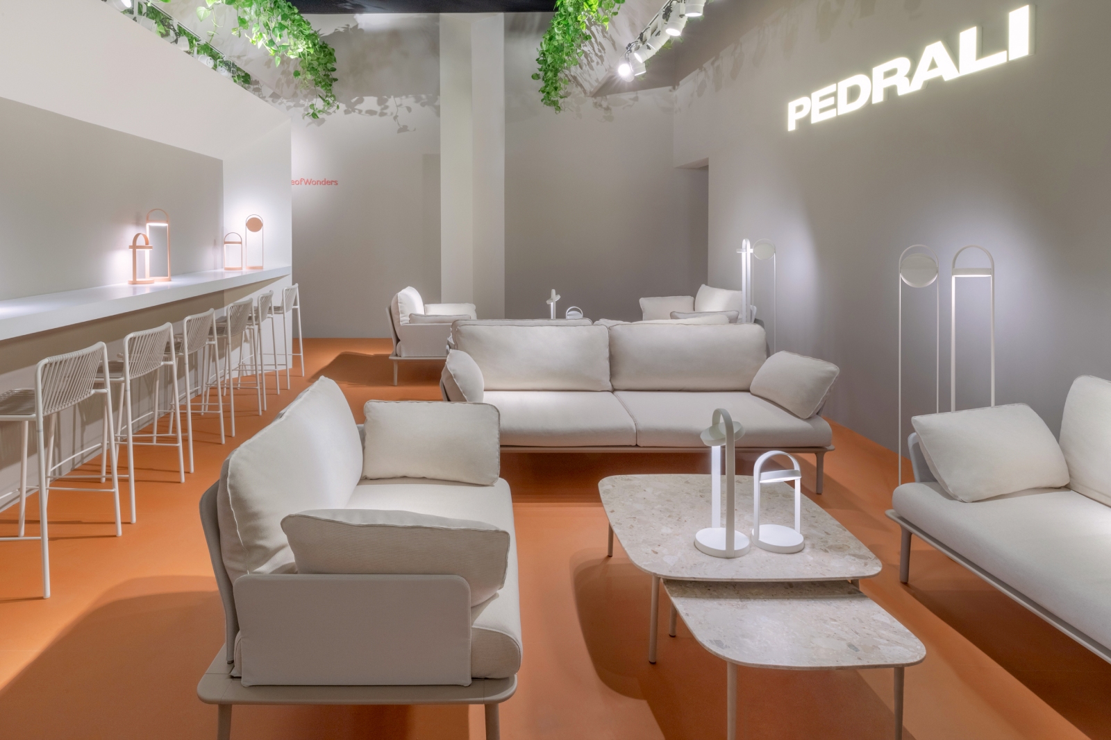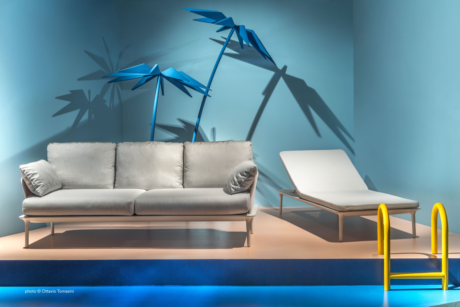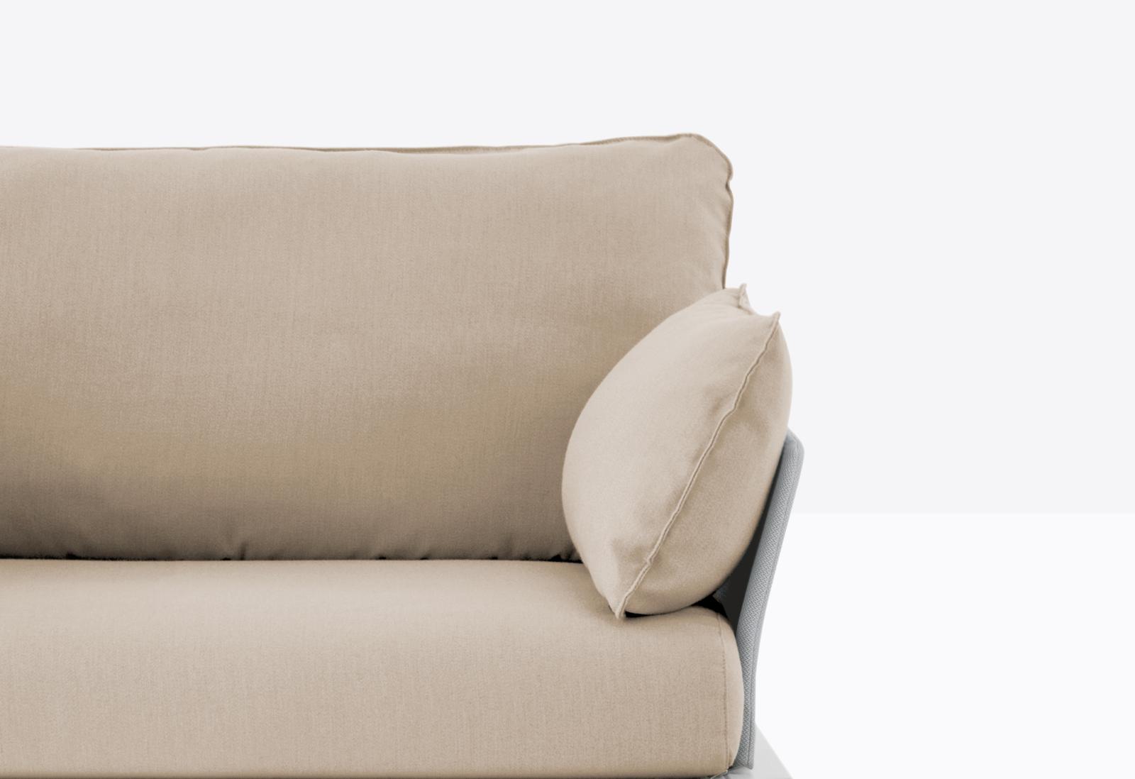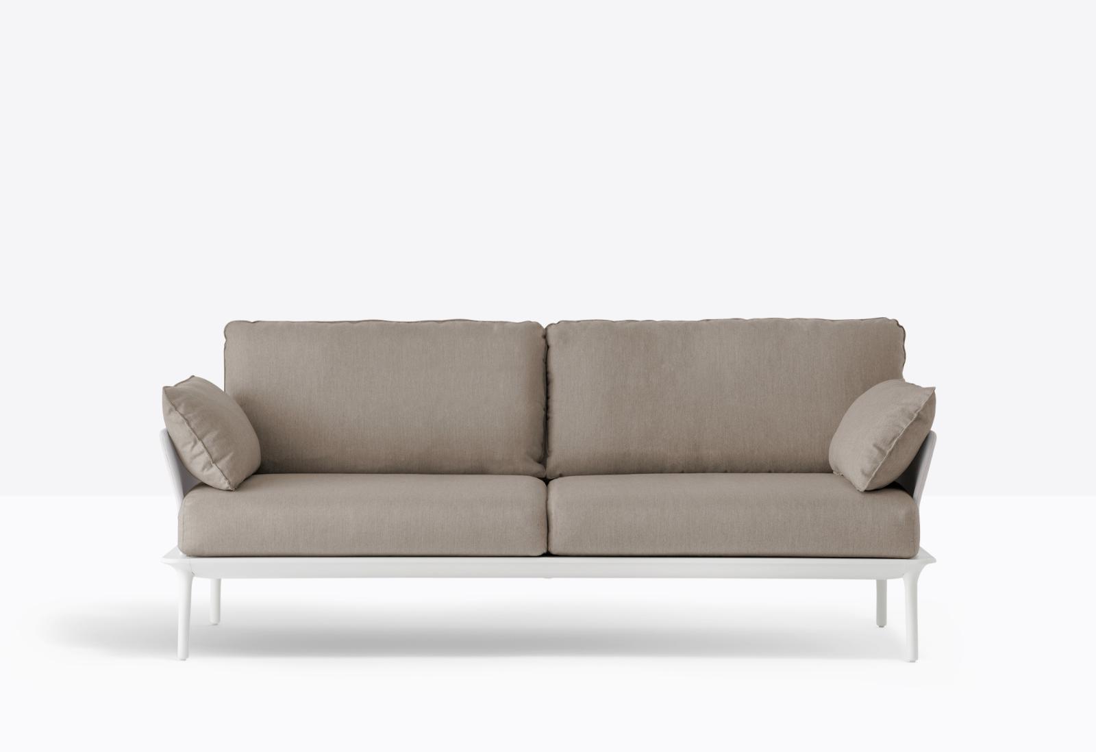 Reva is an outdoor collection with smooth lines and generous sizes. Three-seat sofa with a thin extruded aluminium frame supported by four tapered die-cast aluminium legs that underline its clean design. Cushions in waterproof fabric and polyurethane foam inside.
