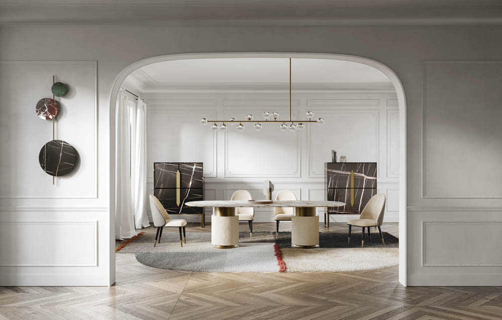 The leather upholstery or fabric of the frame is complemented by a wooden or marble top.