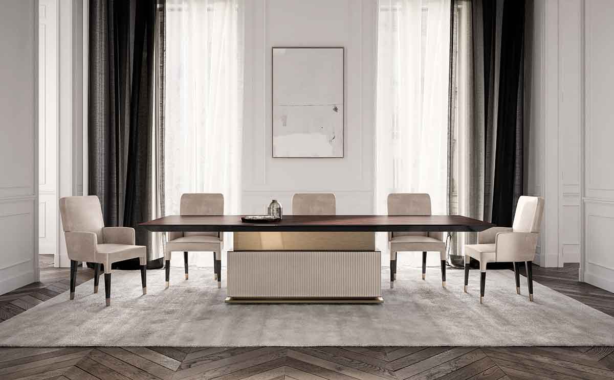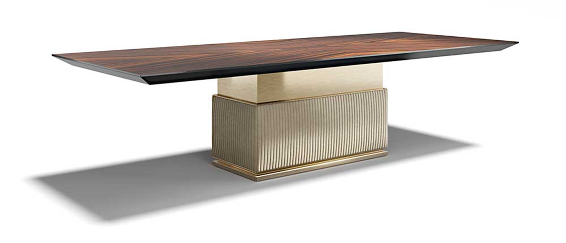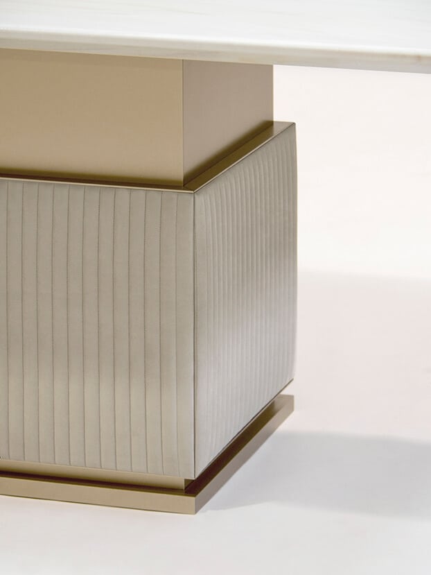 The rectangular base of Rock R features a profile on its structure in metal finish. The leather upholstery or fabric of the frame is complemented by a wooden top. Wooden frame. Metal profiles and details. Base upholstered with leather. Avialable in three sizes: 220 – 280 – 320 Width: 220 - 280 - 320 cm Depth: 120 cm