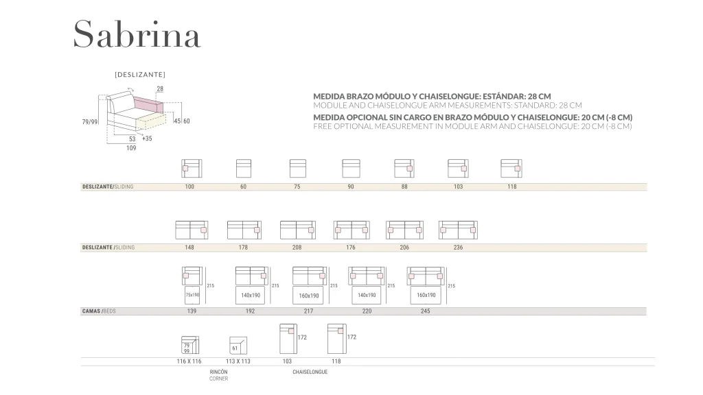 Characteristics .Structure: Solid Pinewood .Suspensión: Metallic framework, springs ZZ .Mechanism: Sliding seat (35 cm.), multi positional headrest, chaiselongue with storage .Seat: 35 Kg. Soft polyurethane foam .Headrest: Super soft foam covered of fibre .Back cushion: Super soft foam covered of fibre .Removable upholstery: Seat, back cushion and headrest .Mechanism (OPTIONAL): Italian system bed. Mattress: +/- 12 Aloe Vera, HR 35 kg.