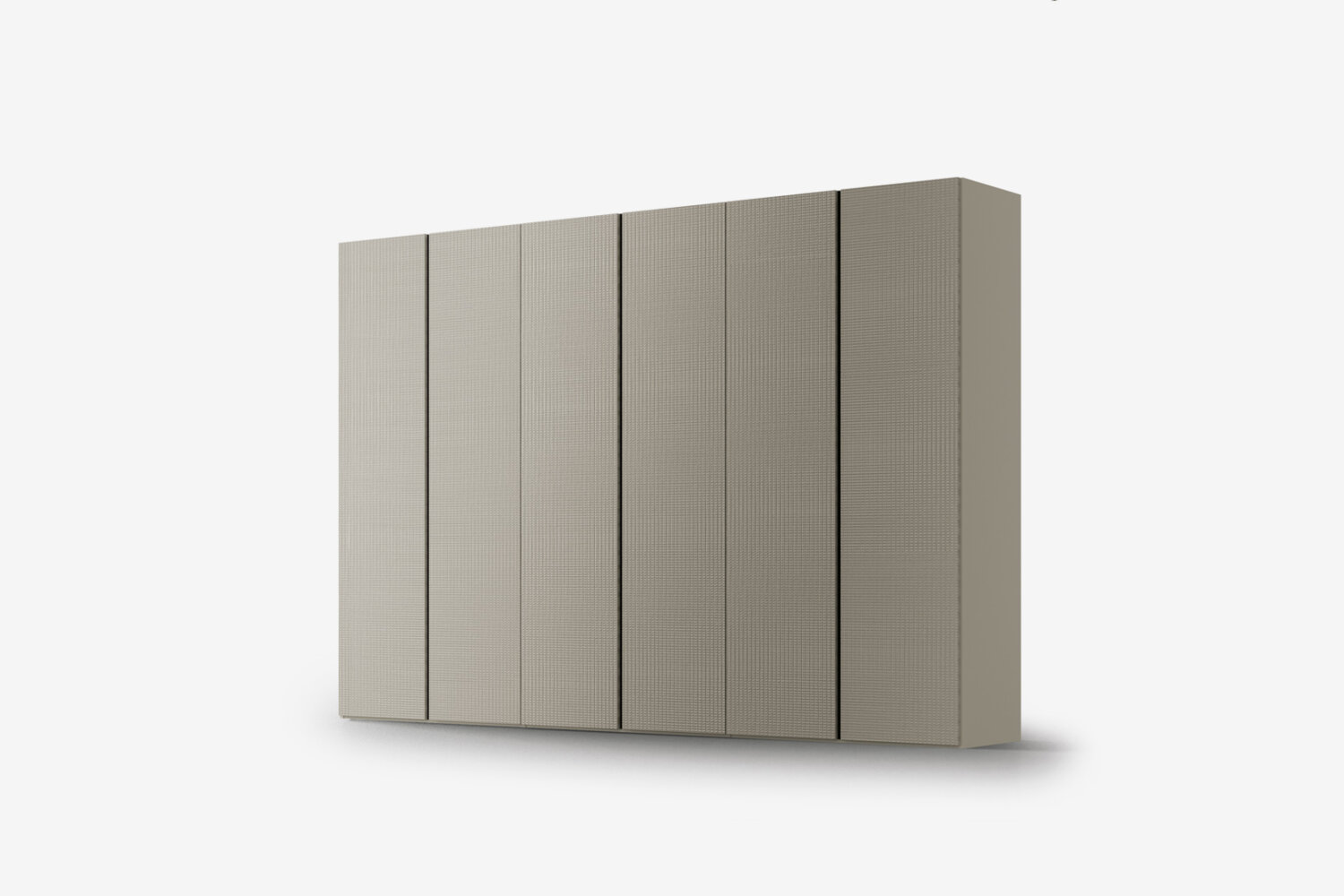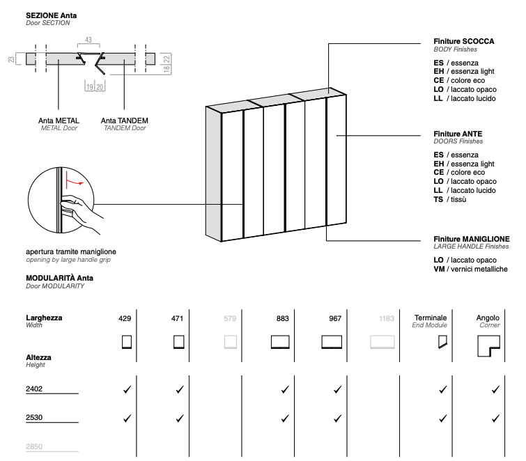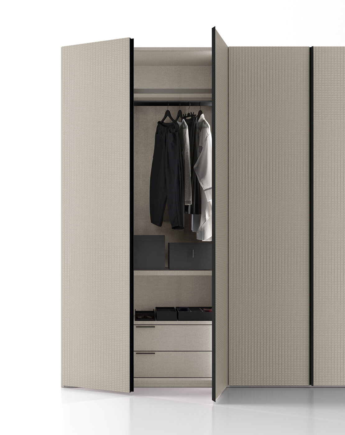 The hinged wardrobe is also available in the Tissù finish, which comes in two colours: Bianco and Limo. A special texture creating a pleasant visual and tactile sensation on the door and the entire wardrobe. For furniture you will enjoy touching. The handle on the Tandem door features a double metal profile that runs vertically up the two doors. What makes this combination unique is the 3D effect created by one profile protruding as a hand grip while the other is carved inwards into the angled depth of the door.
