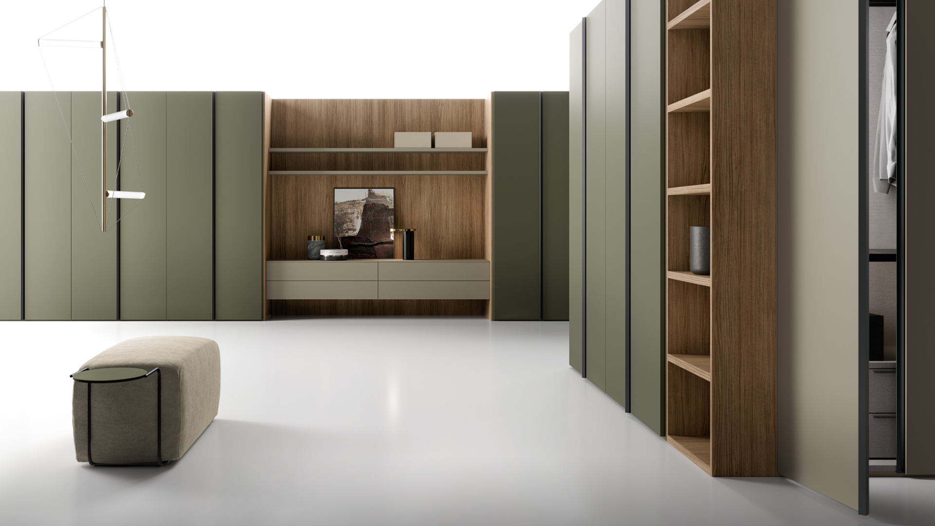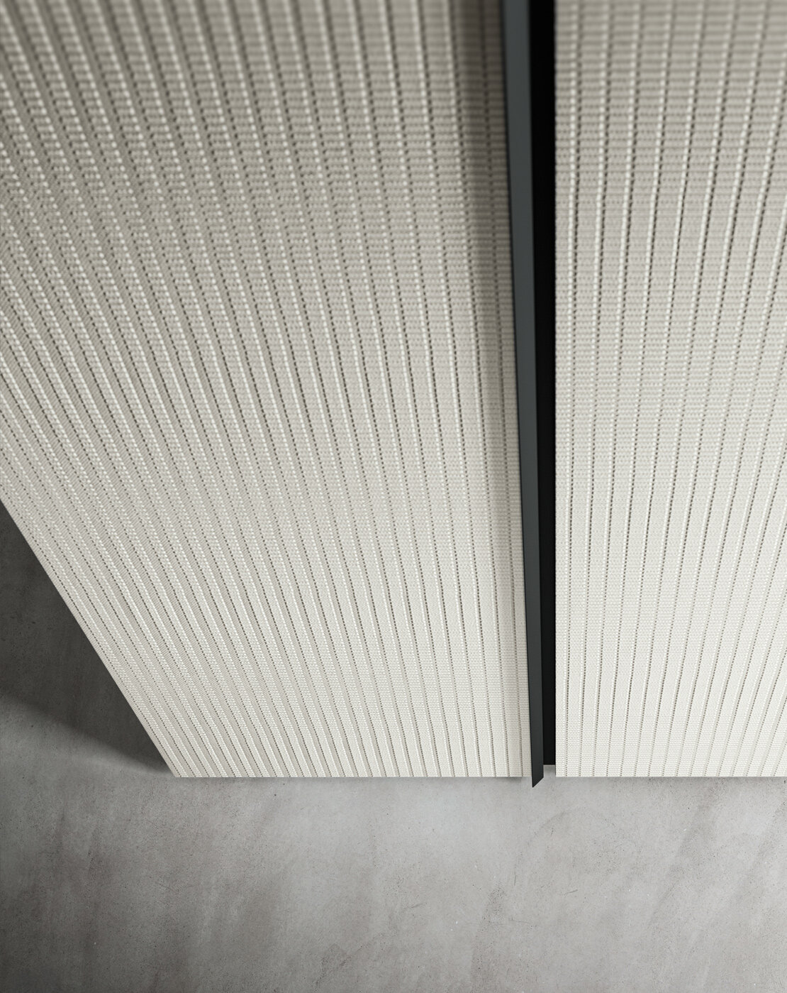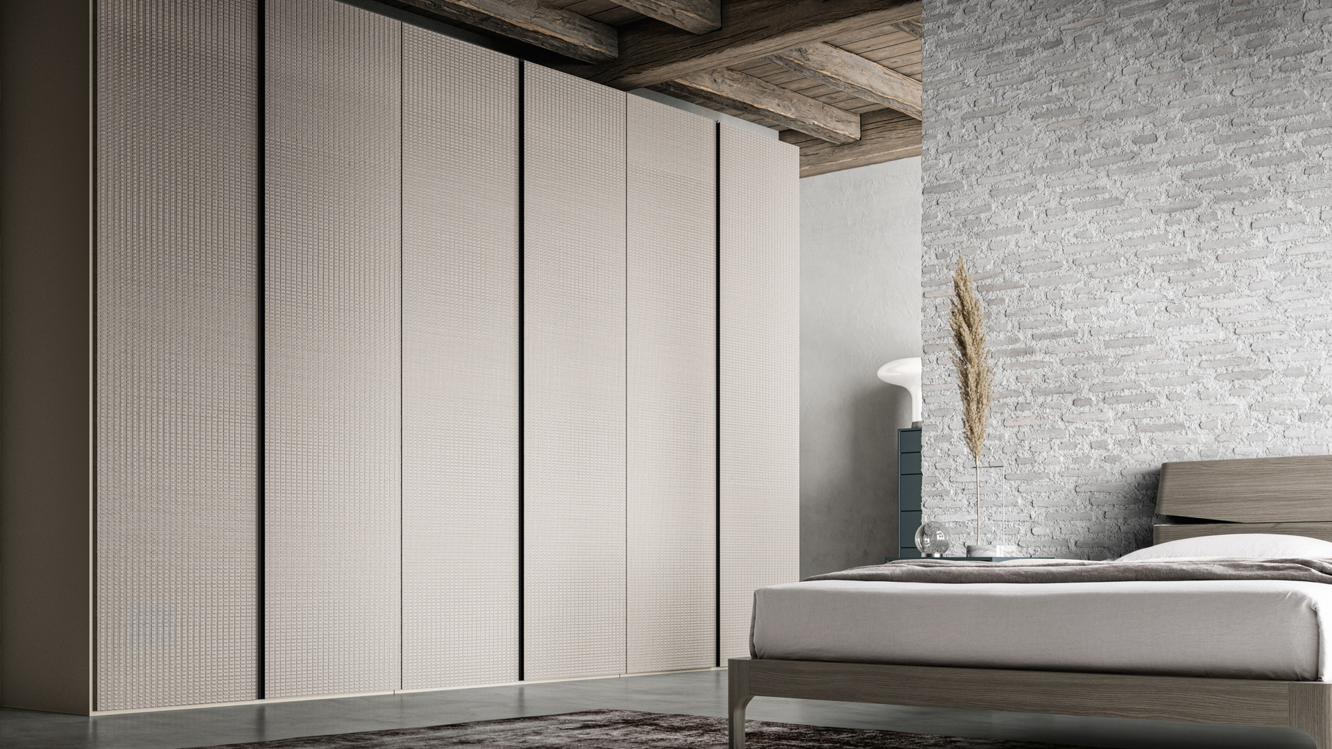 The hinged wardrobe is also available in the Tissù finish, which comes in two colours: Bianco and Limo. A special texture creating a pleasant visual and tactile sensation on the door and the entire wardrobe. For furniture you will enjoy touching. The handle on the Tandem door features a double metal profile that runs vertically up the two doors. What makes this combination unique is the 3D effect created by one profile protruding as a hand grip while the other is carved inwards into the angled depth of the door.