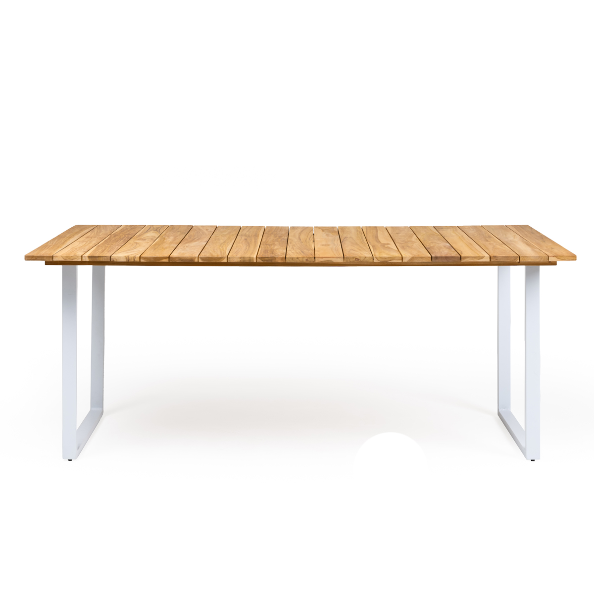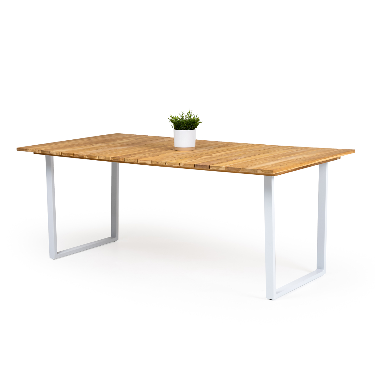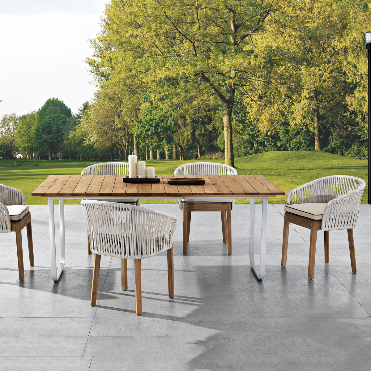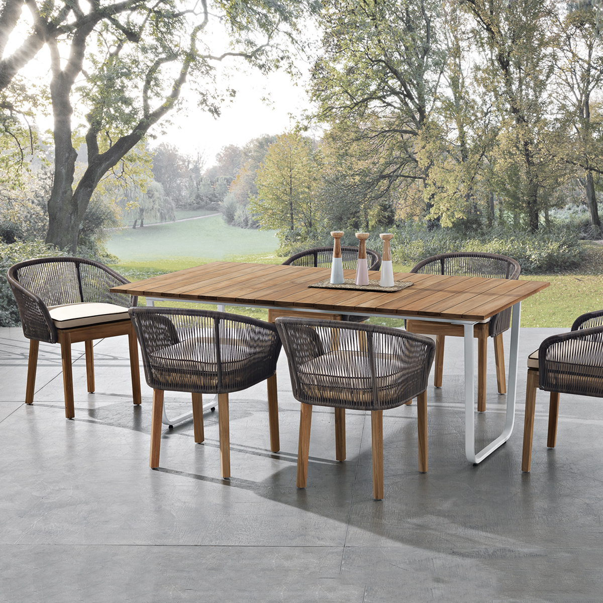 The Yukon dining table by Rosa Splendiani has a minimalist design and plays on the contrast between natural wood and metal.The legs and frame are made of powder-coated, galvanised and lacquered aluminium. The top is handcrafted from solid natural brushed teak slats.The dining table Yukon is perfect to be placed in sheltered outdoor spaces, and can comfortably accommodate up to 8 diners, to live outdoors every moment of conviviality with friends and loved ones.The high quality of the materials, theessentiality of the lines and thecraftsmanship of the workmanship make it a unique and original piece for outdoor and indoor furniture.