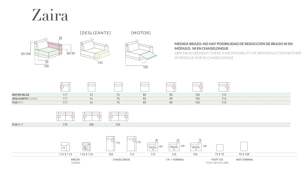 .Mechanism: Electric relax, fix or sliding seat (35 cm), multi positional headrest