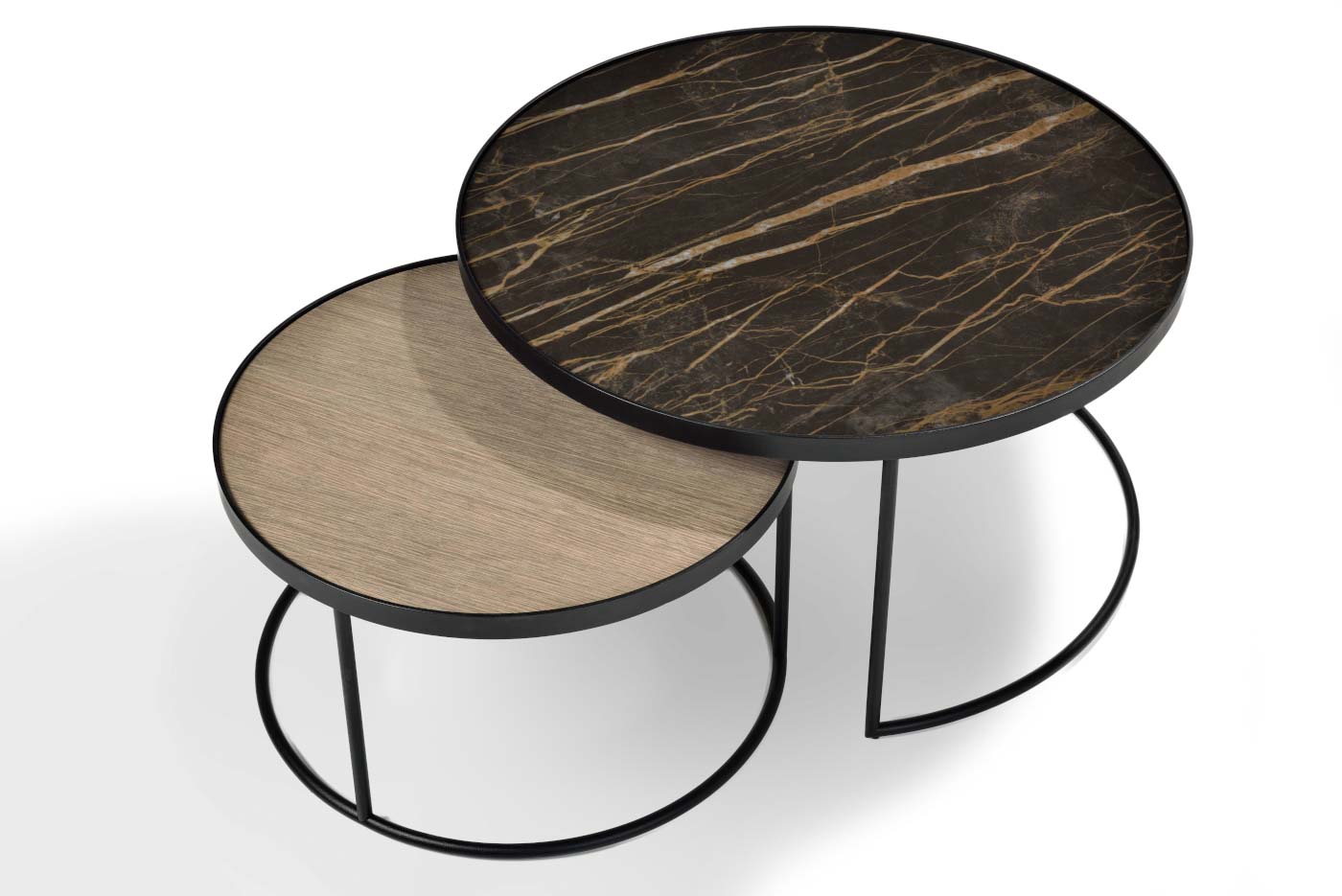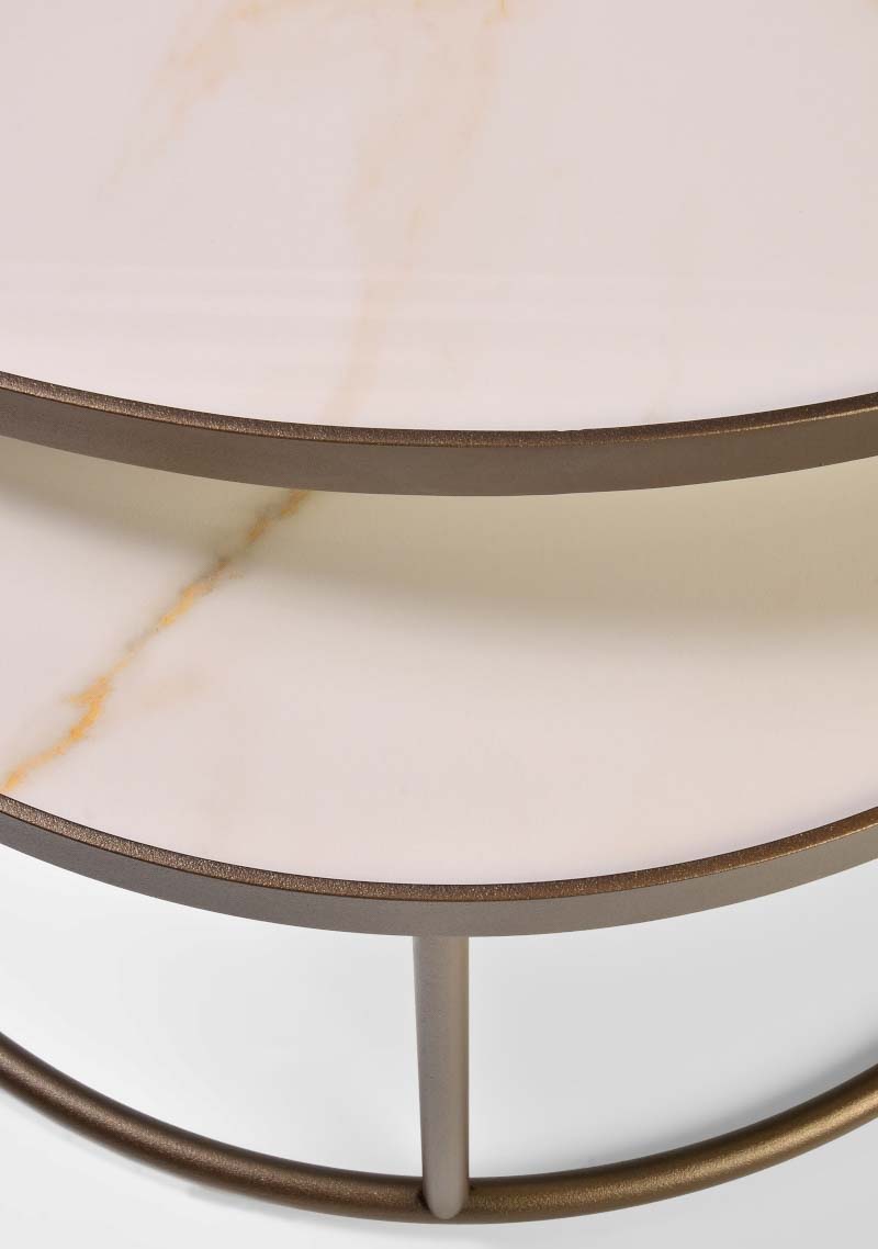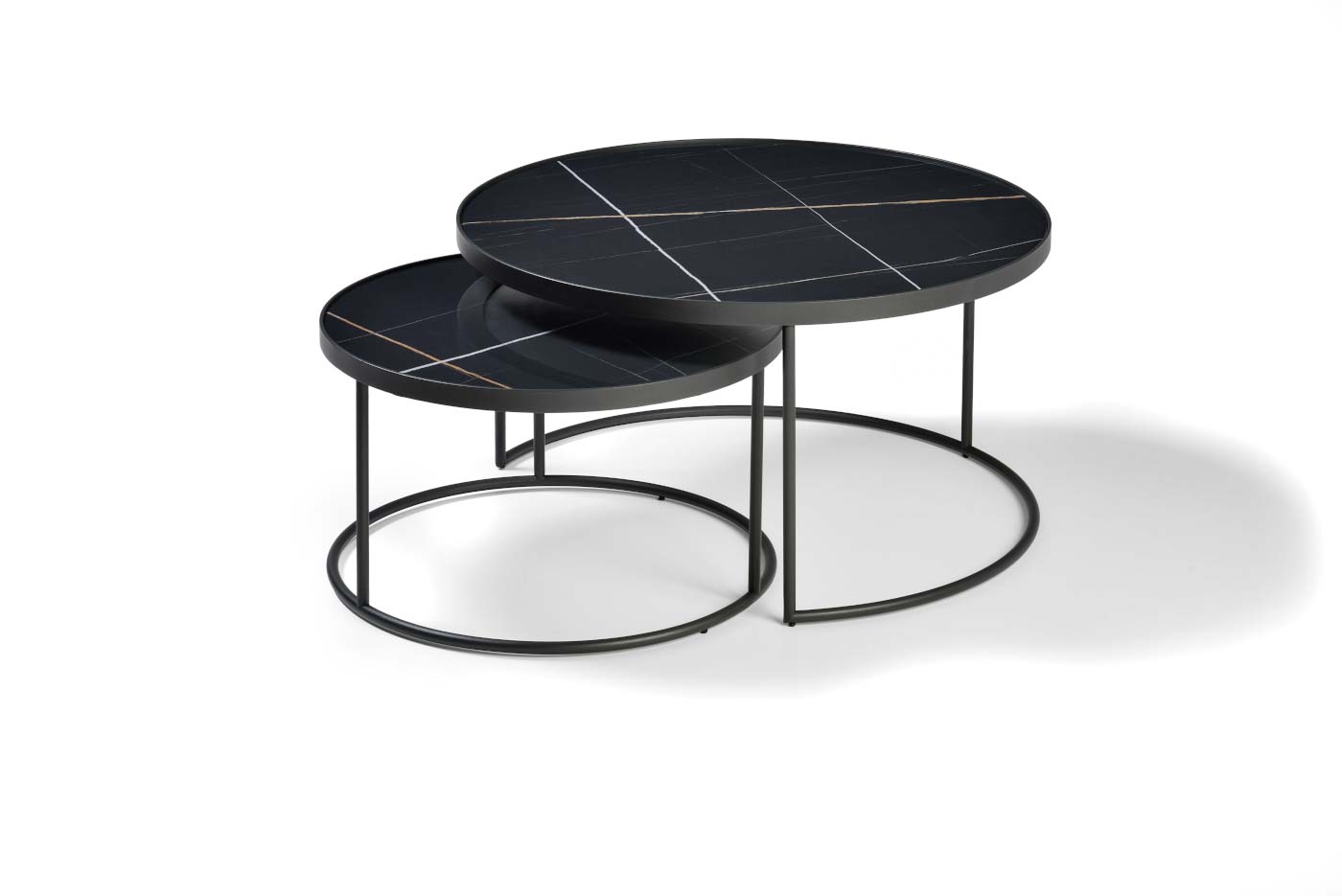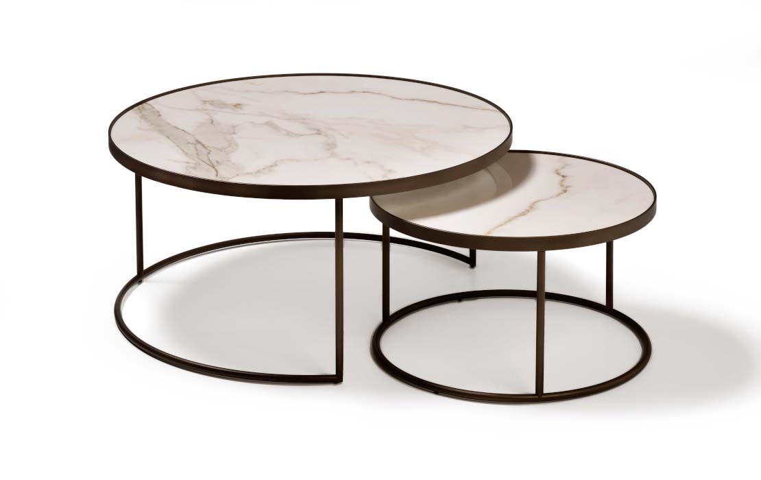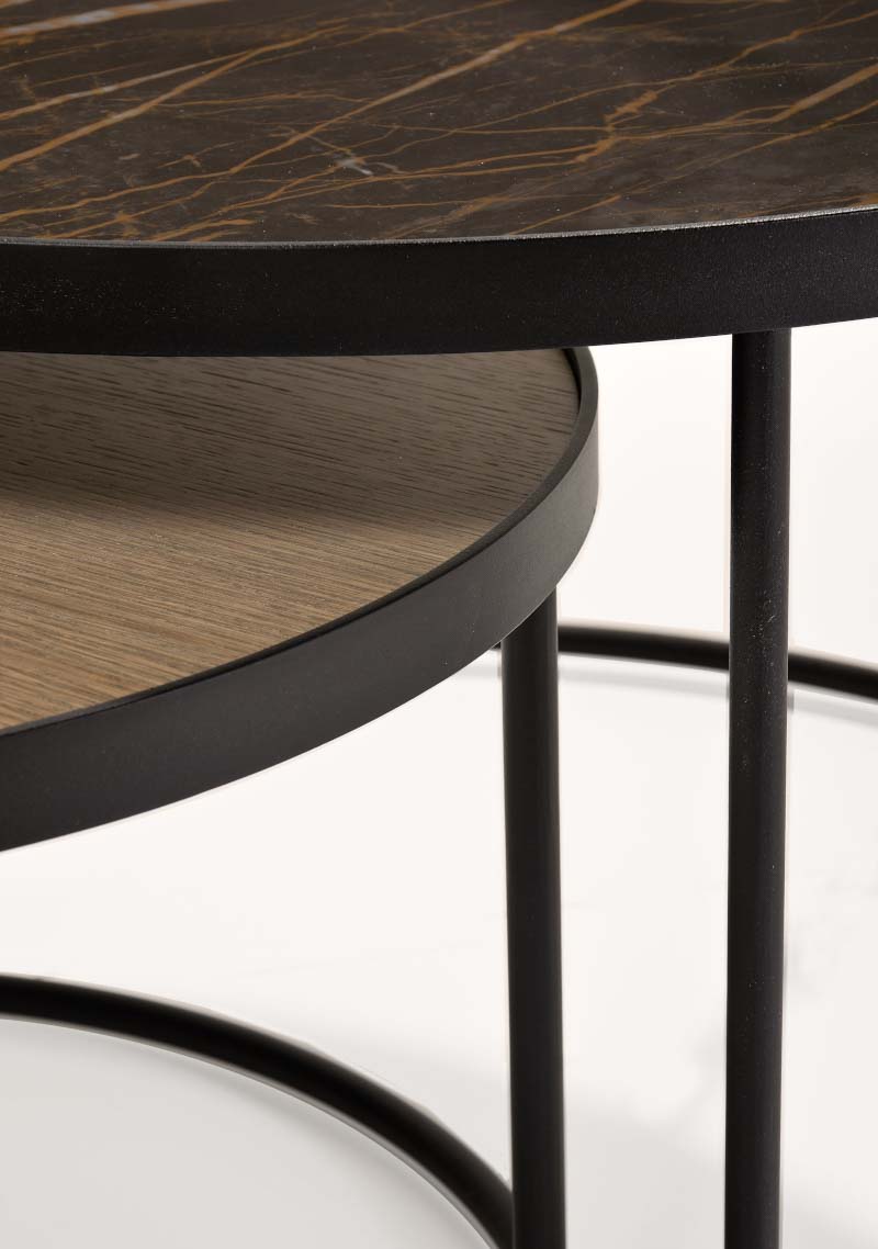 Coffee table in various sizes with veneer round top. Base (open): Metal